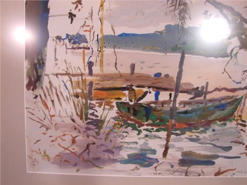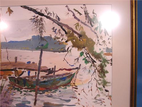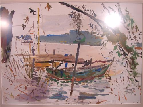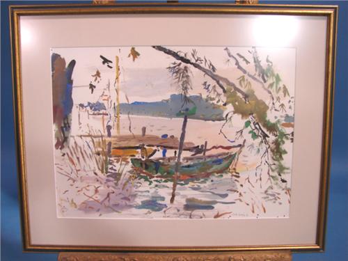 JACK LEWIS (1970) DELAWARE POND LANDSCAPE WATERCOLOR PAINTING. Depicts a docked boat on a pond. Signed in lower right “Jack Lewis 70”. 29.75” x 23.5” framed
