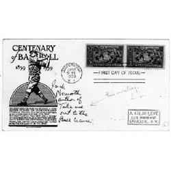 <b>523. JACK NORWORTH</b> (1879 - 1959) American composer remembered for his song "Take Me Out to the Ball Game". Exceptional signed first day postal cover honoring the "Centenary of Baseball 1839-1939", canceled at Cooperstown on June 12, 1939. Across the face of the cover, Norworth writes: "<i>Jack Norworth author of Take me out to the Ball Game</i>". The best possible association piece, in near fine condition. <b>$600-800</b>