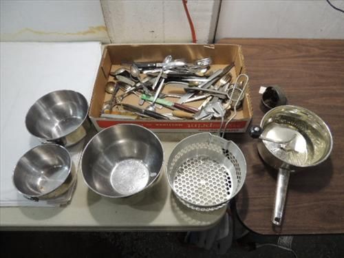 JACK POT LOT VINTAGE KITCHEN UTNECILS: APPLESAUCE STRAINER, STAINLESS STEEL BOWLS, LOTS OF FLATWARE (SOME SILVER PLATED). AS SHOWN. VIEW PICTURE FOR DETAIL.