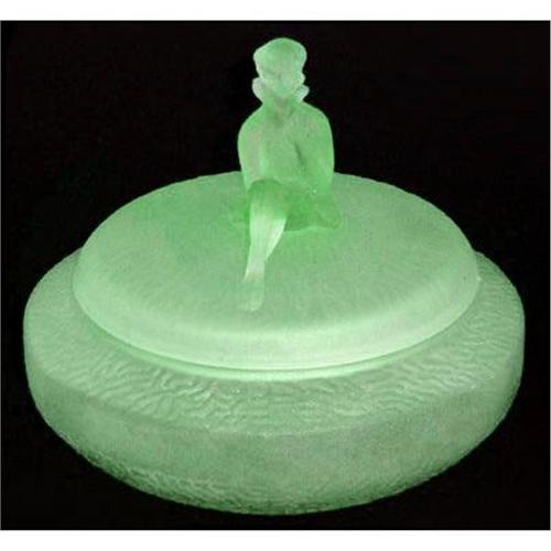 </font></strong>Known as JACKIE this striking, green satin Depression glass figural powder jar features a lid with an Art Deco flapper seated with her legs bent upward at the knees. She has short curly hair and is wearing a short dress or jacket with the collar turned up. This powder jar is shown on page 41 of Whitmeyer - Bedroom & Bathroom Glassware of the Depression Years. Beautifully executed with fine definition to her face and figure she measures 6" tall x 5" across. Both the jar and lid are in excellent condition. </font>