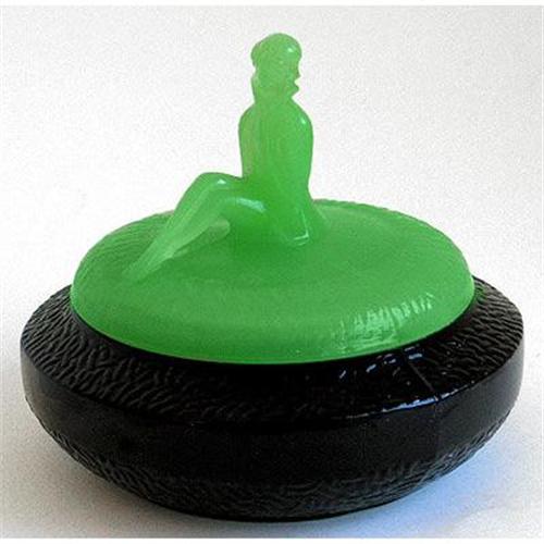 Known as JACKIE and very rare with a Jadite lid and Black Amethyst color jar. This outstanding Depression glass figural powder jar features an Art Deco flapper seated with her legs bent upward at the knees. She has short curly hair and is wearing a short dress or jacket with the collar turned up. This powder jar is shown and described on pages 40-41 in Whitmyer - Bedroom & Bathroom Glassware of the Depression Years. Beautifully executed with fine definition to her face and figure she measures 6 inches tall x 5 inches across. Both the jar and lid are in excellent condition.