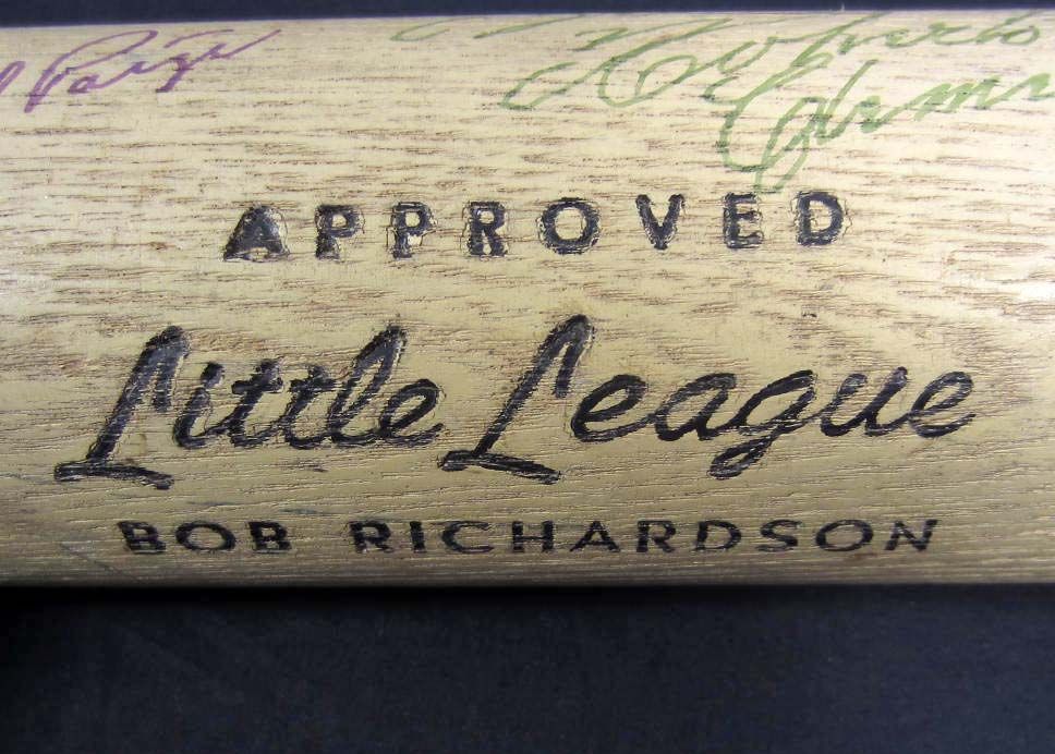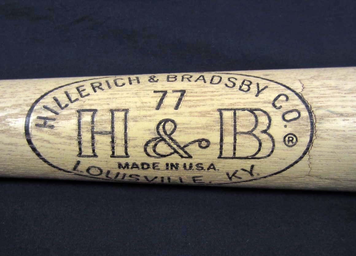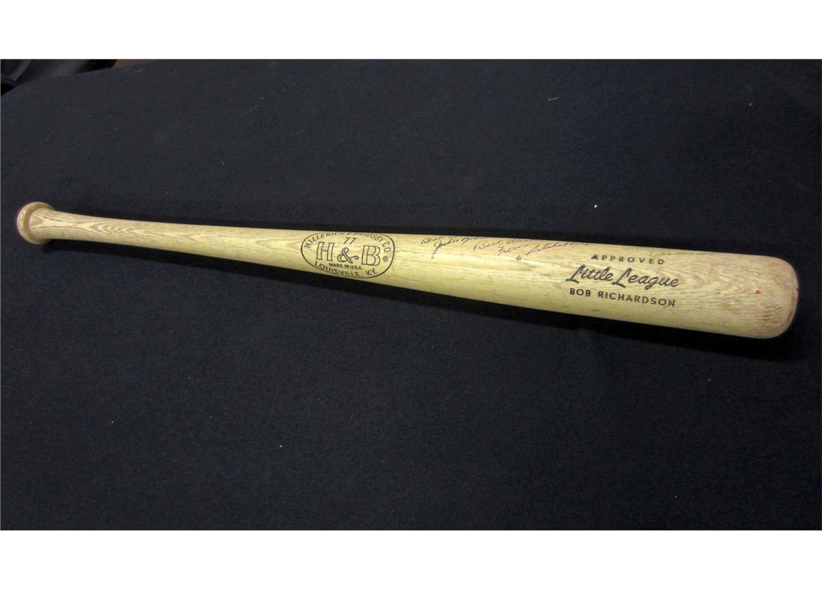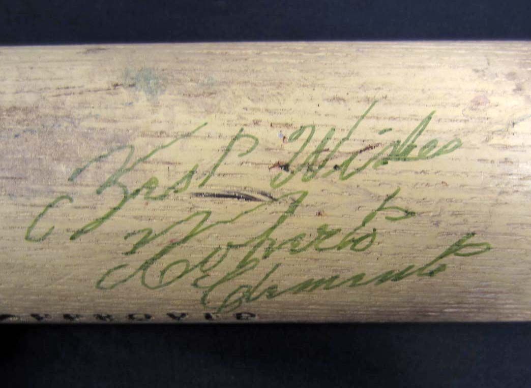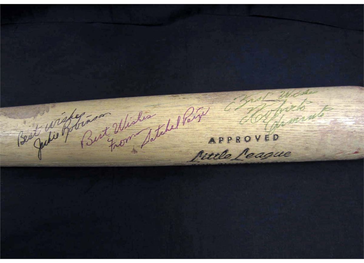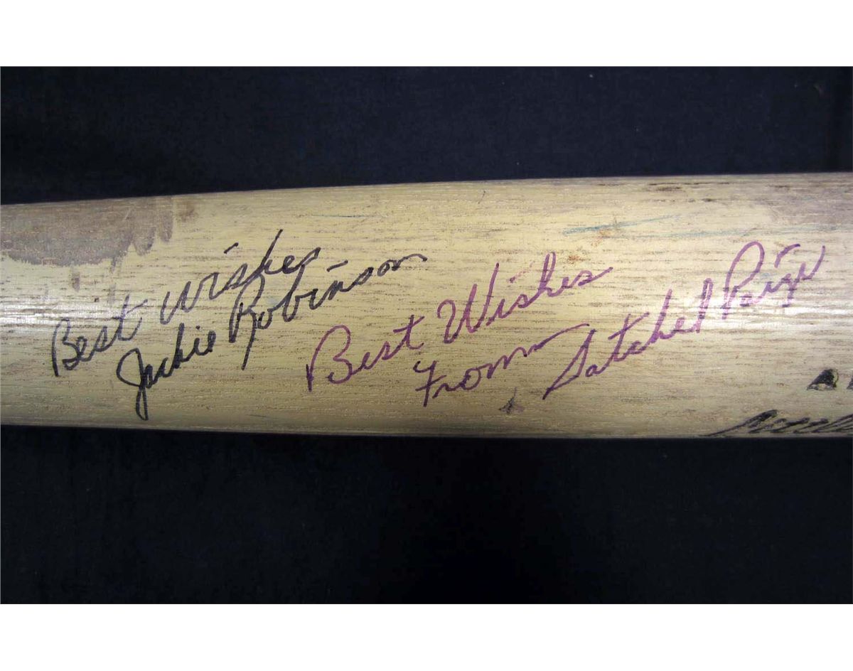 Hillerich & Bradsby no 77 baseball bat signed "Best Wishes Jackie Robinson" in black ink, "Best Wishes from Satchel Paige" in purple ink and "Best Wishes Roberto Clemente" in green ink.