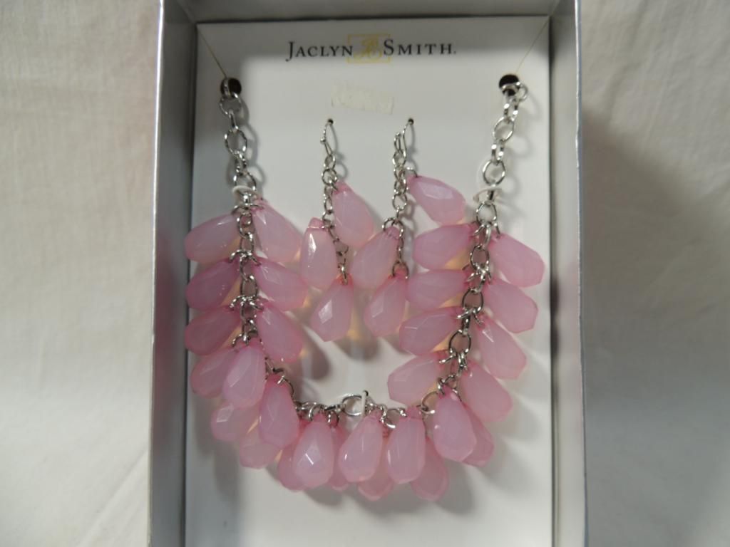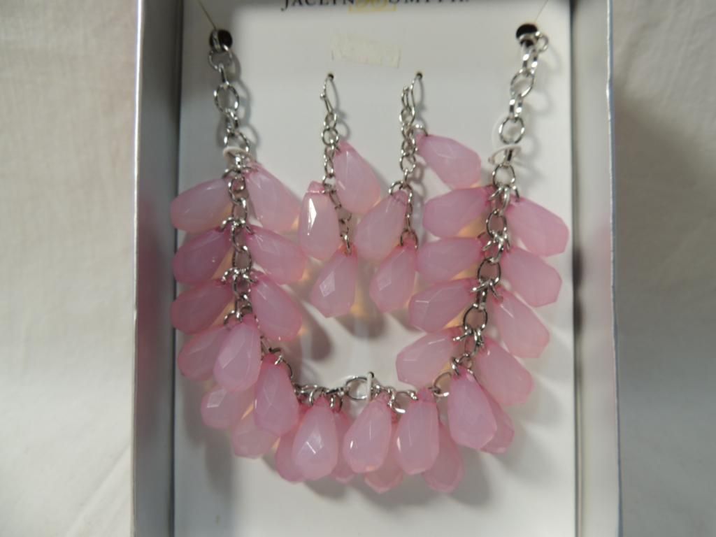 PINK BEADED NECKLACE & EARRINGS MATCHING SET. SILVERTONE CHAIN TEAR DROP BEAD. AS SHOWN. SEE PHOTO FOR MORE DETAILS