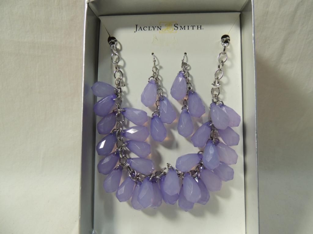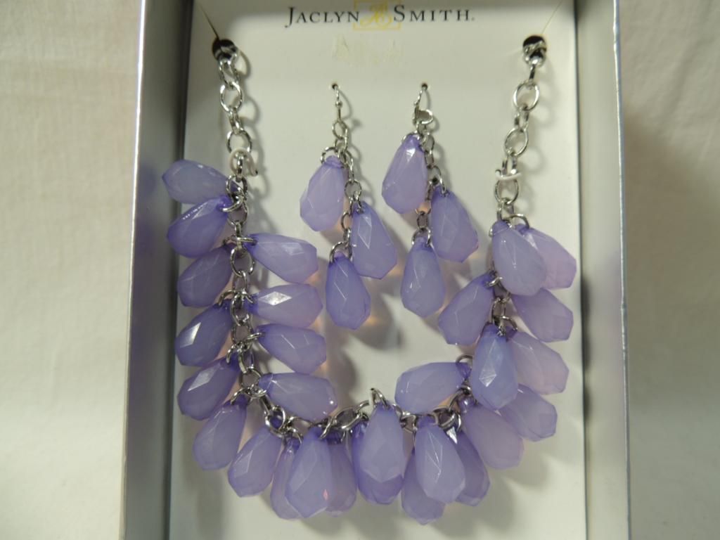 PURPLE BEADED NECKLACE & EARRING SET. SILVERTONE CHAIN MATCHING SET. TEAR DROP BEAD. COSTUME JEWELRY. NEW IN BOX. FASHION JEWELRY. COLLECTIBLE JACLYN SMITH DESIGNER JEWELRY. AS SHOWN. SEE PHOTO FOR MORE DETAILS.