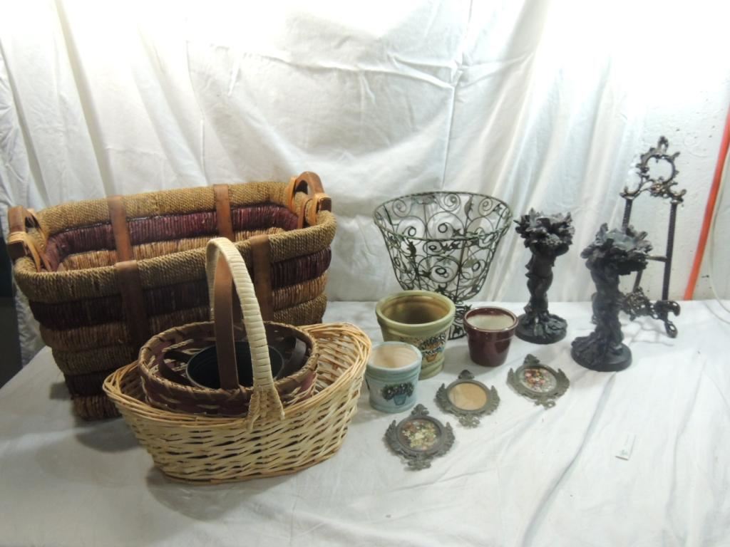 FLOWER POTS, DECORATIVE BASKET, WICKER BASKET, CANDLE HOLDERS, VINTAGE AS SHOWN SEE PHOTO FOR MORE DETAILS.