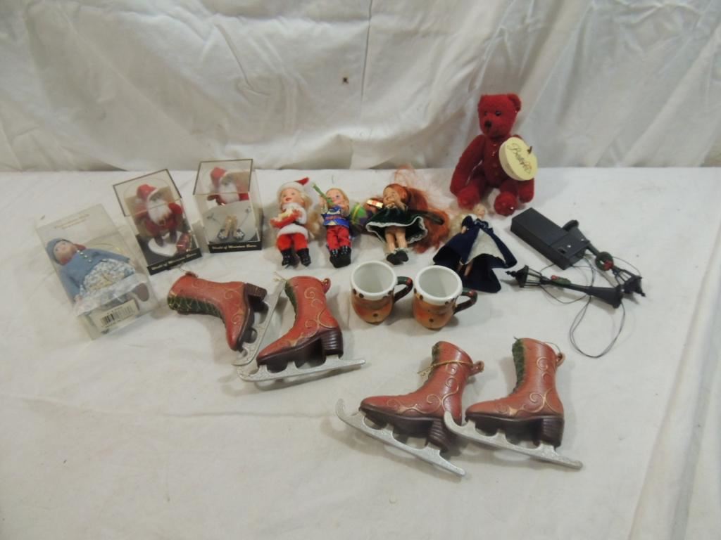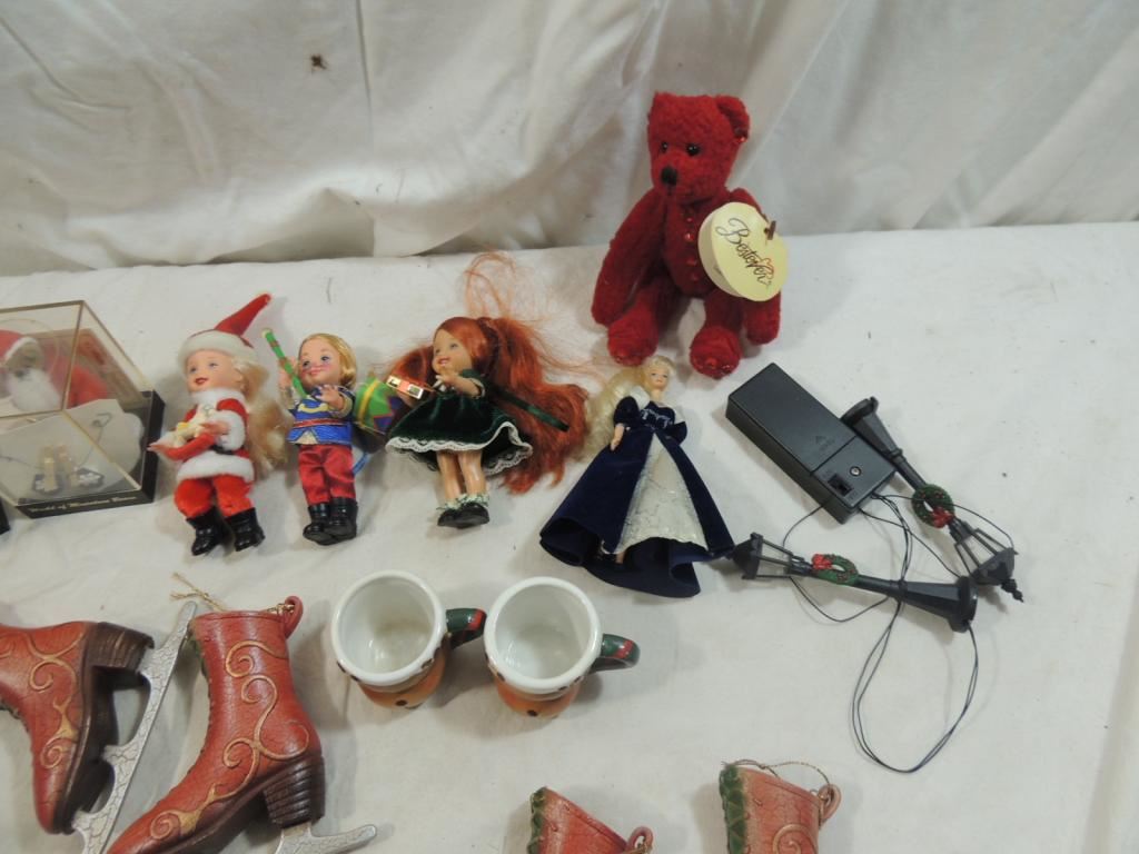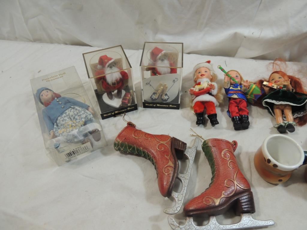 MINIATURE DOLL, PORCELAIN DOLLS, ORNAMENTS, COLLECTIBLE DOLLS AS SHOWN SEE PHOTO FOR MORE DETAILS.