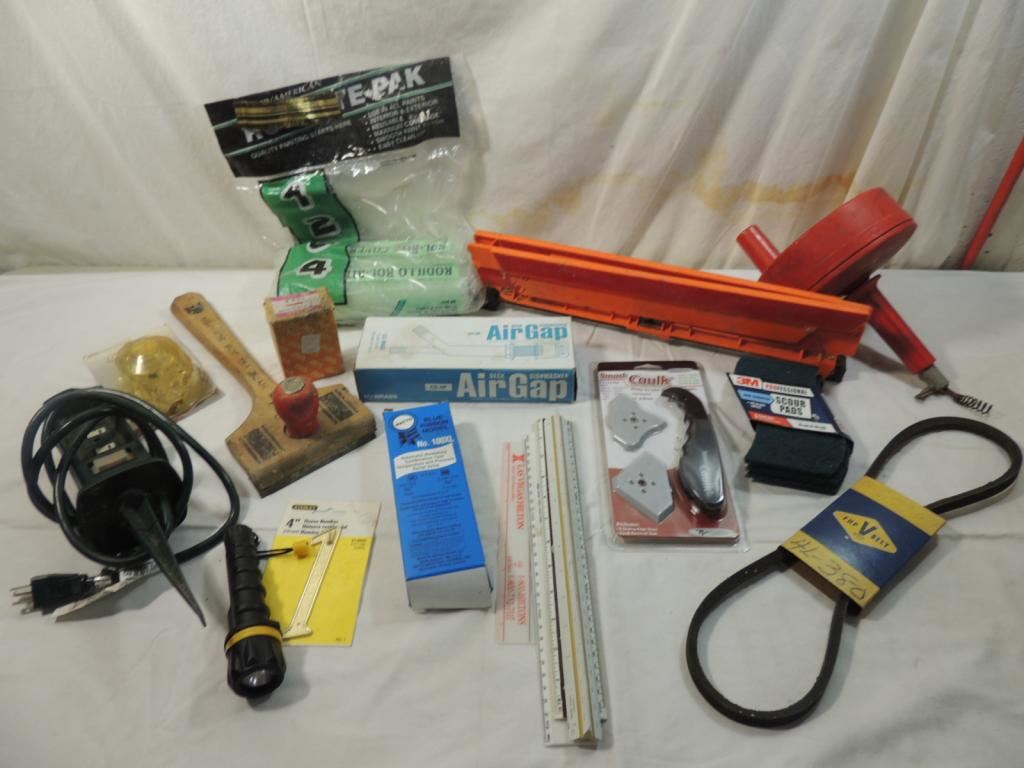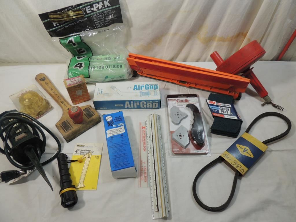 FLASHLIGHT, RULERS, DECK AIR CAP, BELTS, SMART CAULK, OUTDOOR ELECTRIC PLUG, SCREWS, HOME IMPROVEMENT, GARAGE, AS SHOWN SEE PHOTO FOR MORE DETAILS.