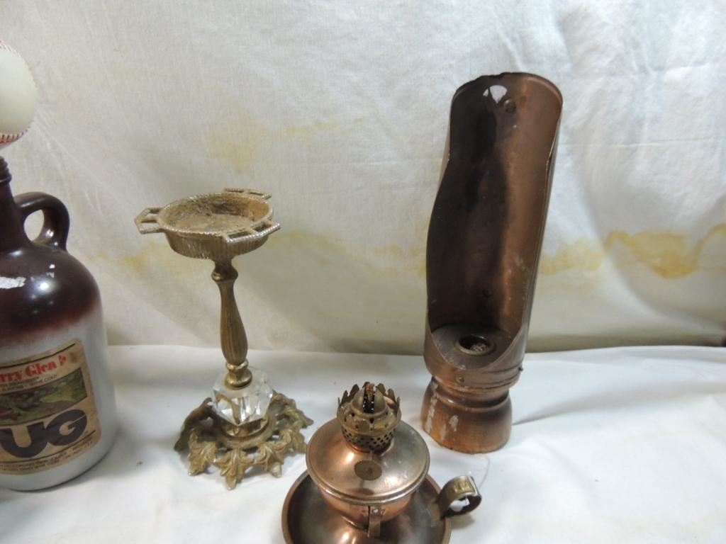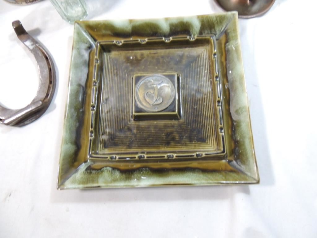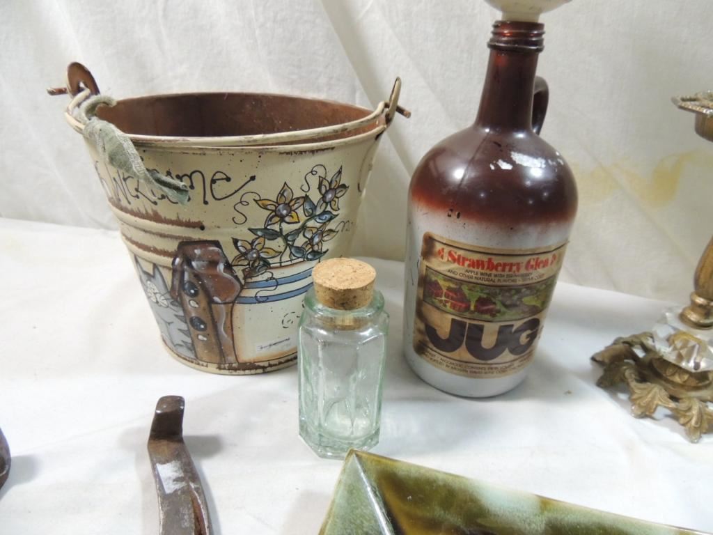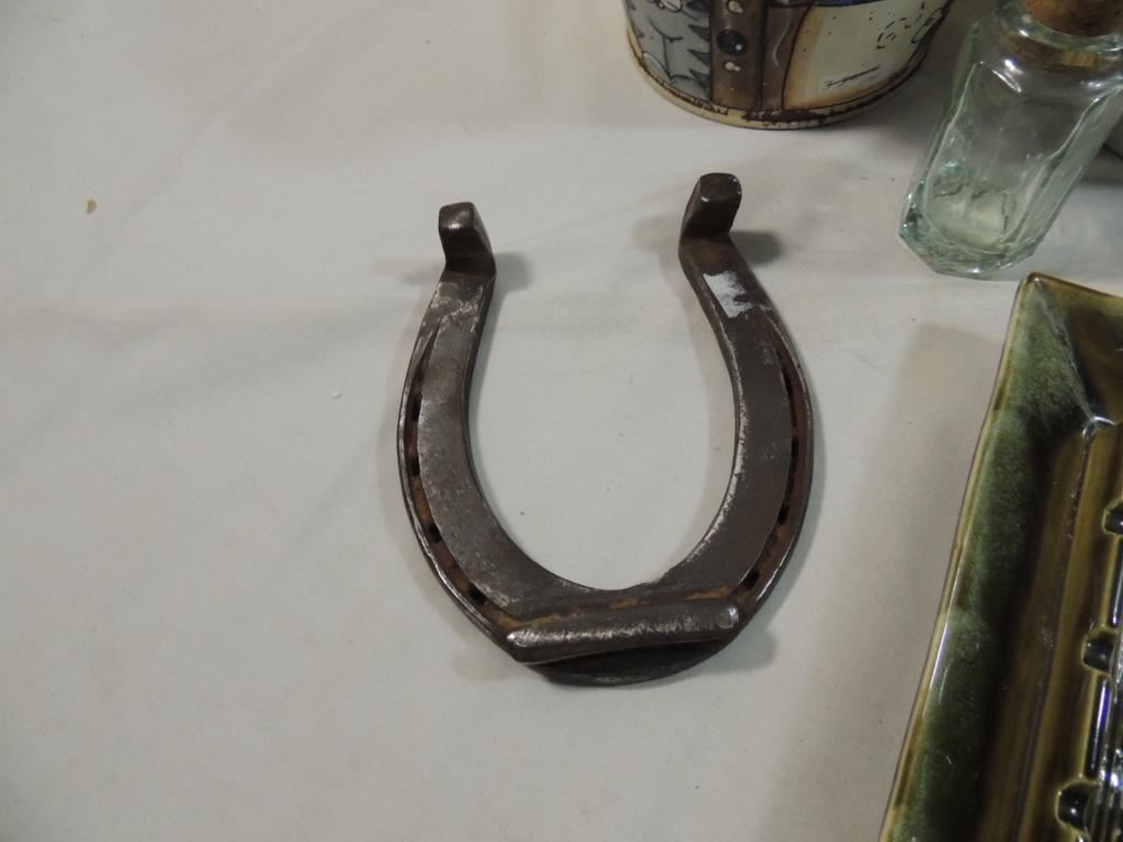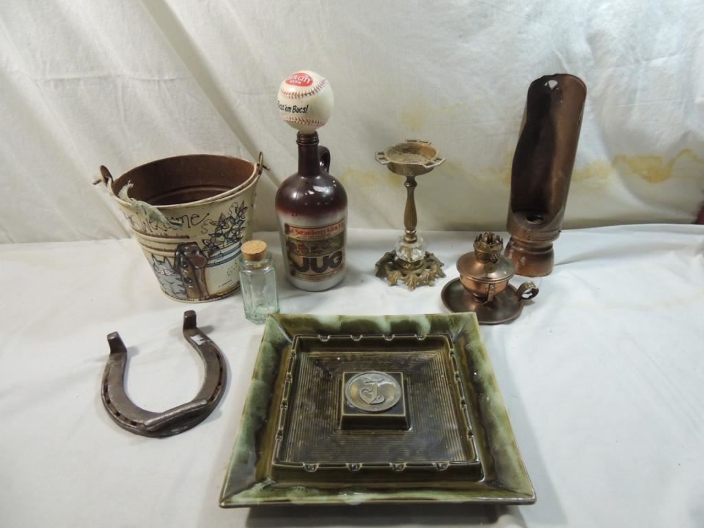 HORSESHOE, COPPER CANDLE HOLDER, DECORATIVE PAIL, LARGE CERAMIC ASHTRAY, GLASS BOTTLE, CANDLE HOLDER, IRON CITY BEER JUG AS SHOWN SEE PHOTO FOR MORE DETAILS.