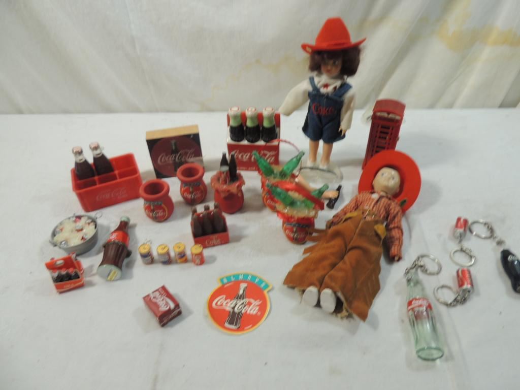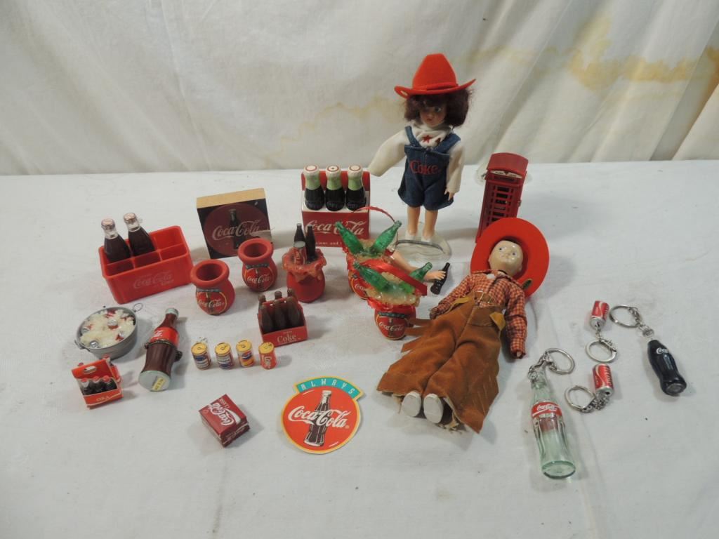 SMALL DOLLS, MINIATURE BOTTLES, REPLICAS, CERAMIC, BOXES, COCA COLA COLLECTIBLES, COCA COLA COLLECTORS, COCA COLA MEMORABILIA, ASSORTED ITEMS, VINTAGE, UNIQUE AND RARE FROM A PRIVATE COLLECTION, AS SHOWN SEE PHOTO FOR MORE DETAILS.
