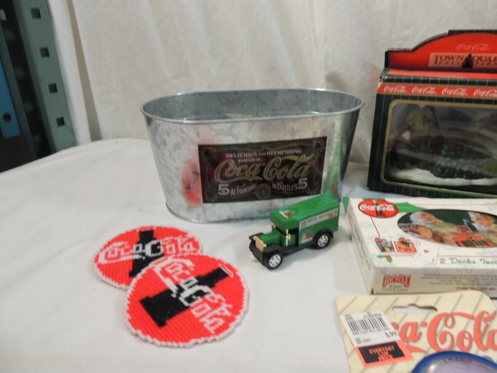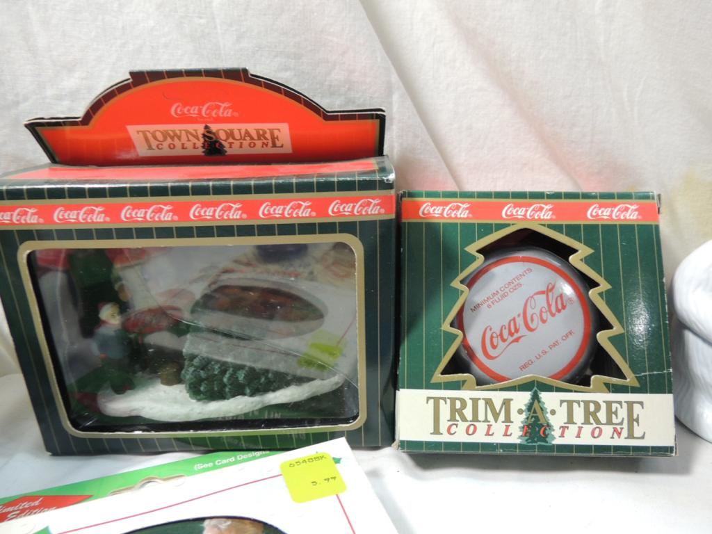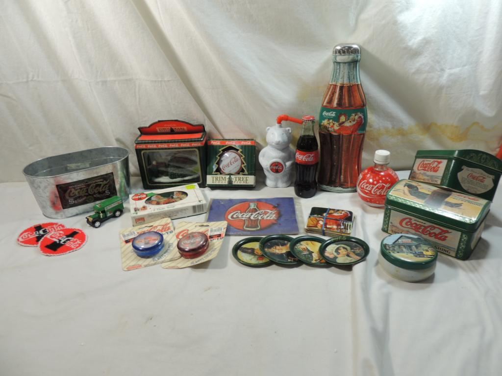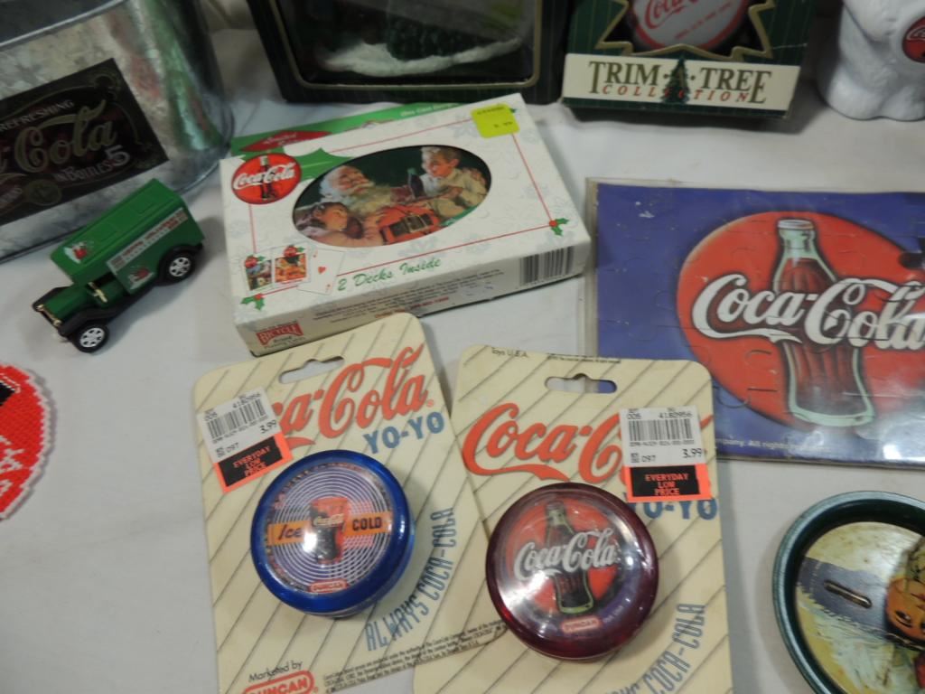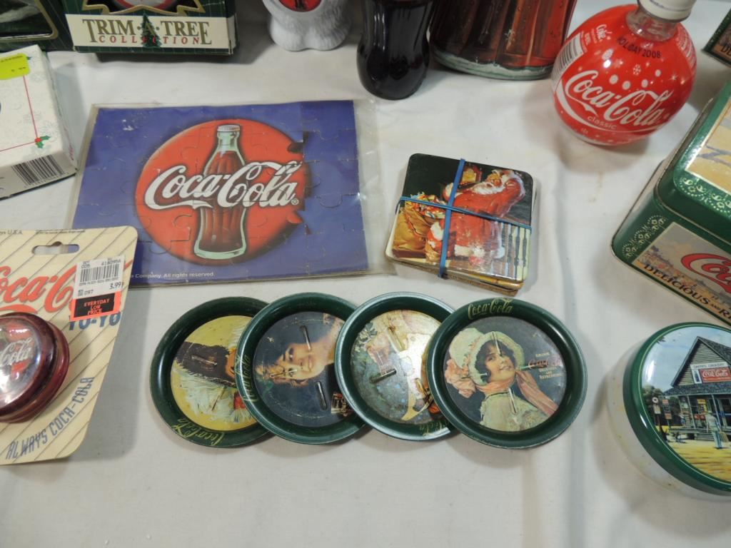 COCA COLA MEMORABILIA AND COLLECTIBLES POLAR BEAR CUP, BOTTLE SHAPED TIN, YO-YO, BUCKET, PUZZLE, DECORATIVE TINS, COCA COLA GLASS BOTTLE 2008 HOLIDAY BOTTLE, ORNAMENT, AS SHOWN SEE PHOTO FOR MORE DETAILS