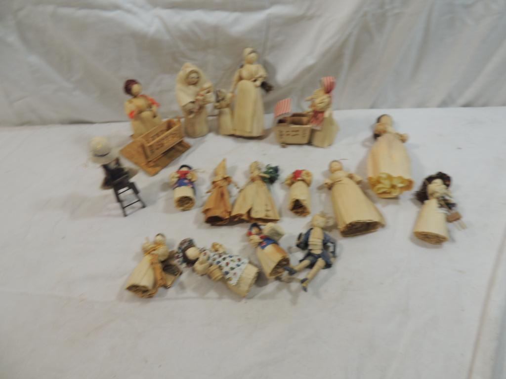 CORN STALK DOLLS, VINTAGE DOLLS, COLLECTIBLE DOLLS, VINTAGE DOLLS, VARIOUS DOLLS, SIZES, ACCESSORIES, COLLECTIBLE AS SHOWN SEE PHOTO FOR MORE DETAILS