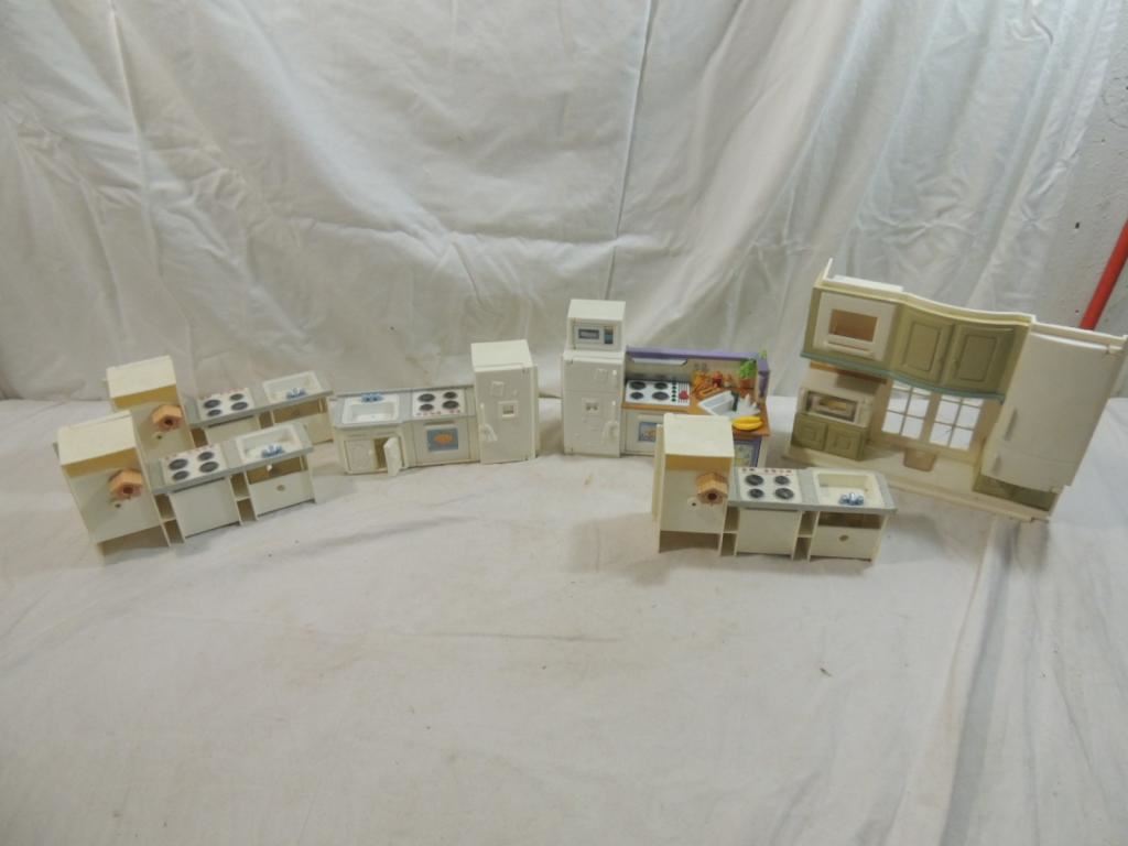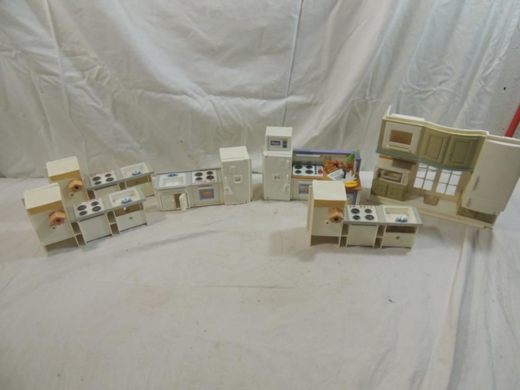 KITCHEN CABINET SETS, KITCHEN DISPLAYS, VINTAGE KITCHENS, PLASTIC SETS, DOLL HOUSE ACCESSORIES, DOLL HOUSE AS SHOWN SEE PHOTO FOR MORE DETAILS.