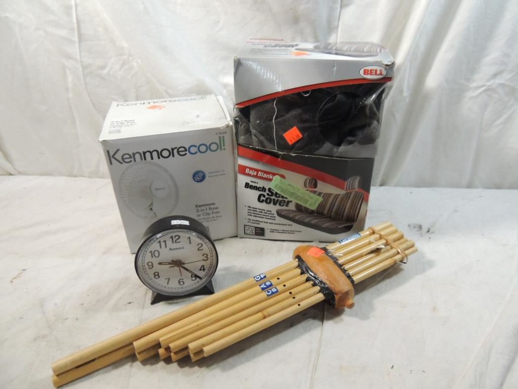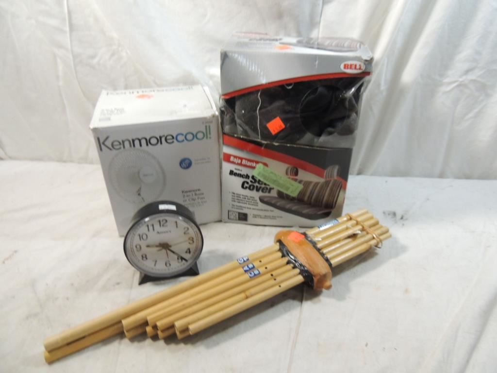 KENMORE COOL SMALL FAN, CARSEAT, WHISTLE, ALARM CLOCK AS SHOWN SEE PHOTO FOR MORE DETAILS.
