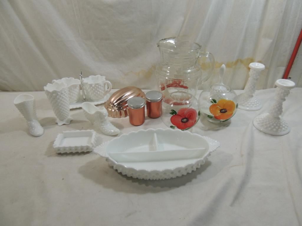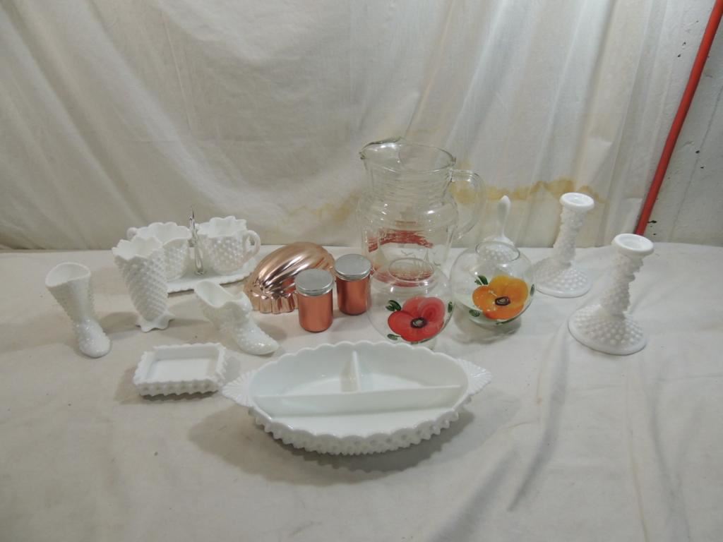 1930S HAND PAINTED GLASS VASES, BATMAN FOREVER GLASS MUGS MADE IN FRANCE , CERAMIC MUG, GLASS BEADEDS, VINTAGE MILK GLASS, HOB NOB GLASS, CANDLE STICK HOLDERS, SUGAR BOWL & CREAMER, SMALL VASE, ASH TRAY, HAND BELL, SHOE DECORATIVE, RELISH TRAY, SEPERATED TRAY, AS SHOWN SEE PHOTO FOR MORE DETAILS.