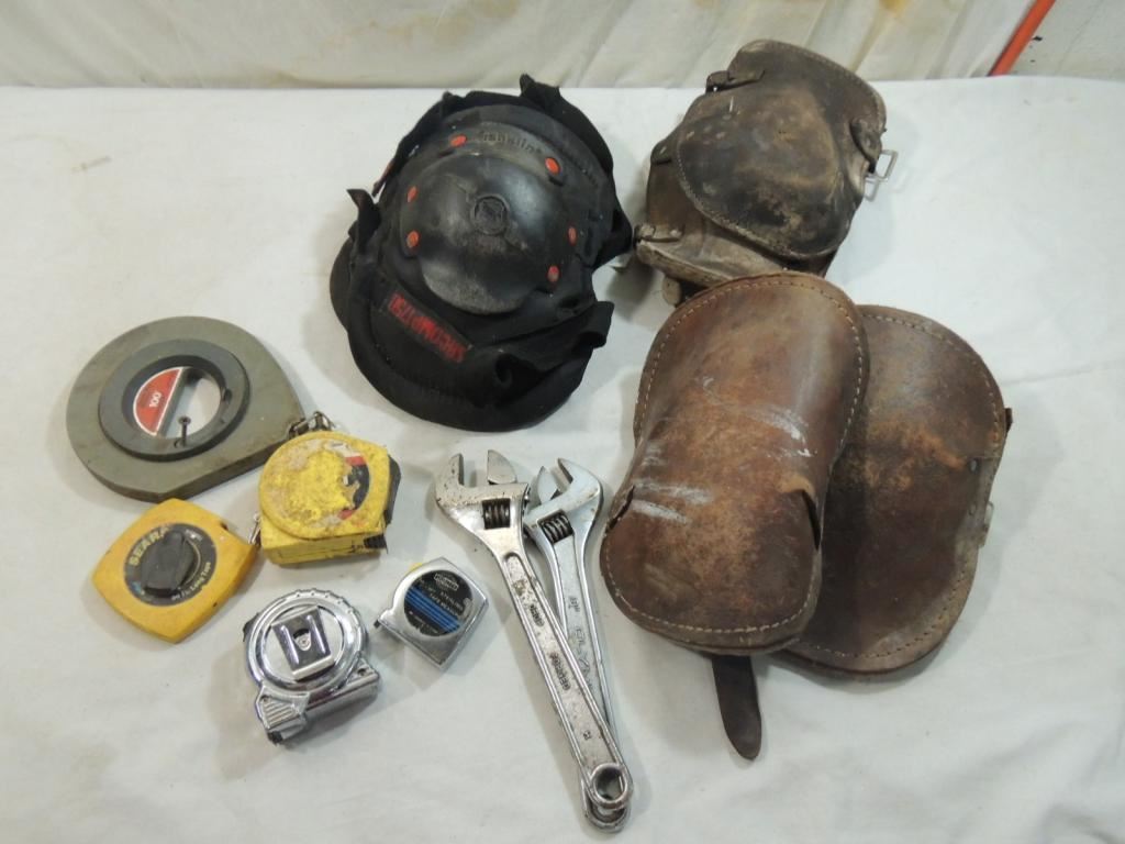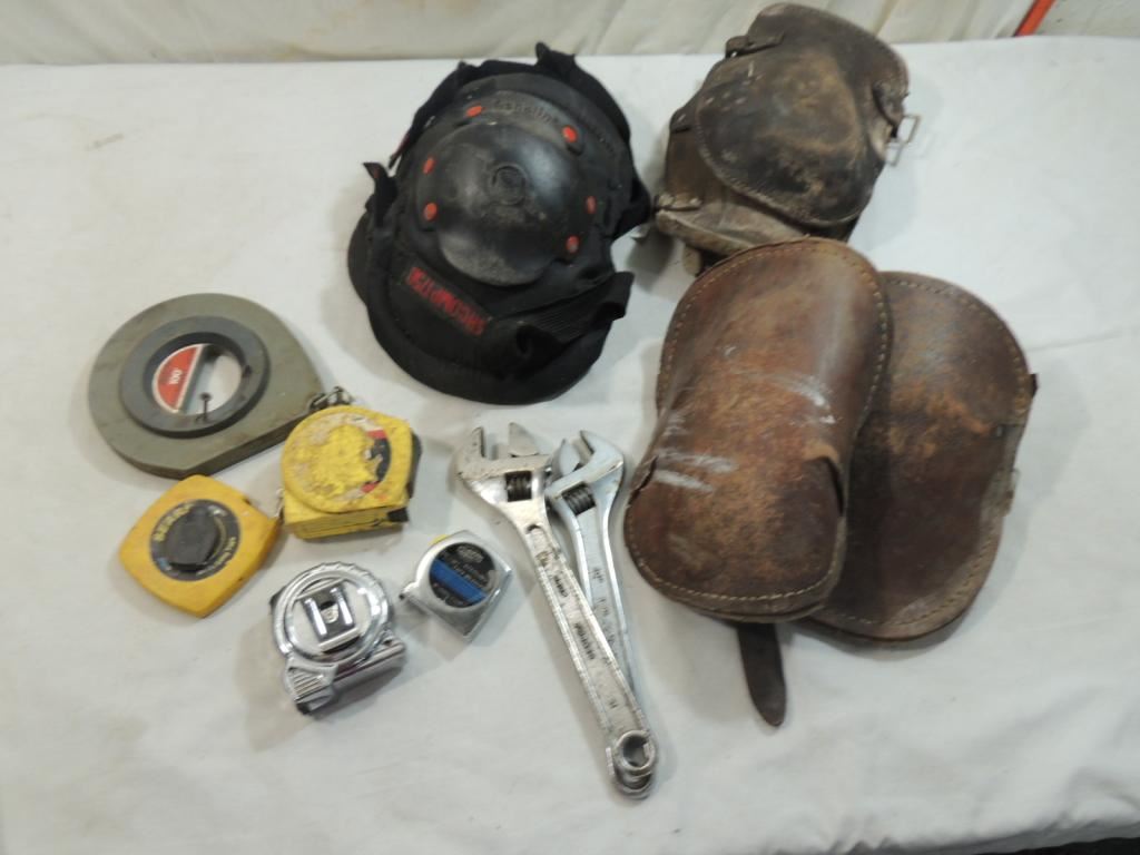 KNEEPADS, TAPE MEASURE, CHALK LINE, WRENCH, HOME IMPROVEMENT, LEATHER KNEE PAD, AS SHOWN SEE PHOTO FOR MORE DETAILS.