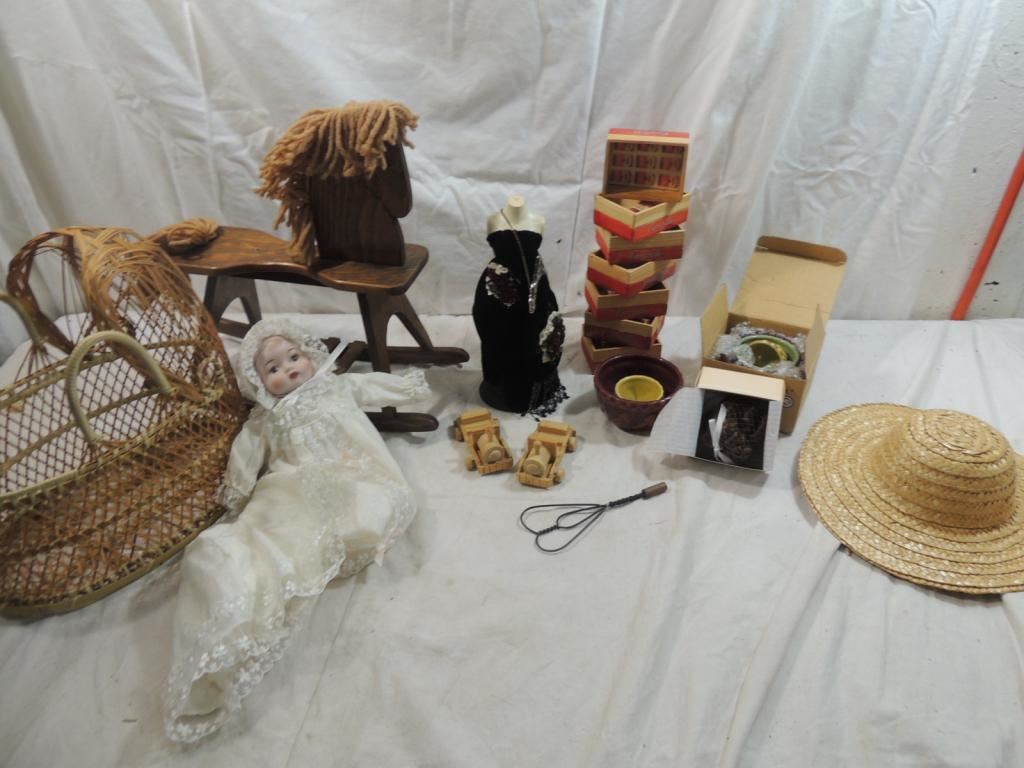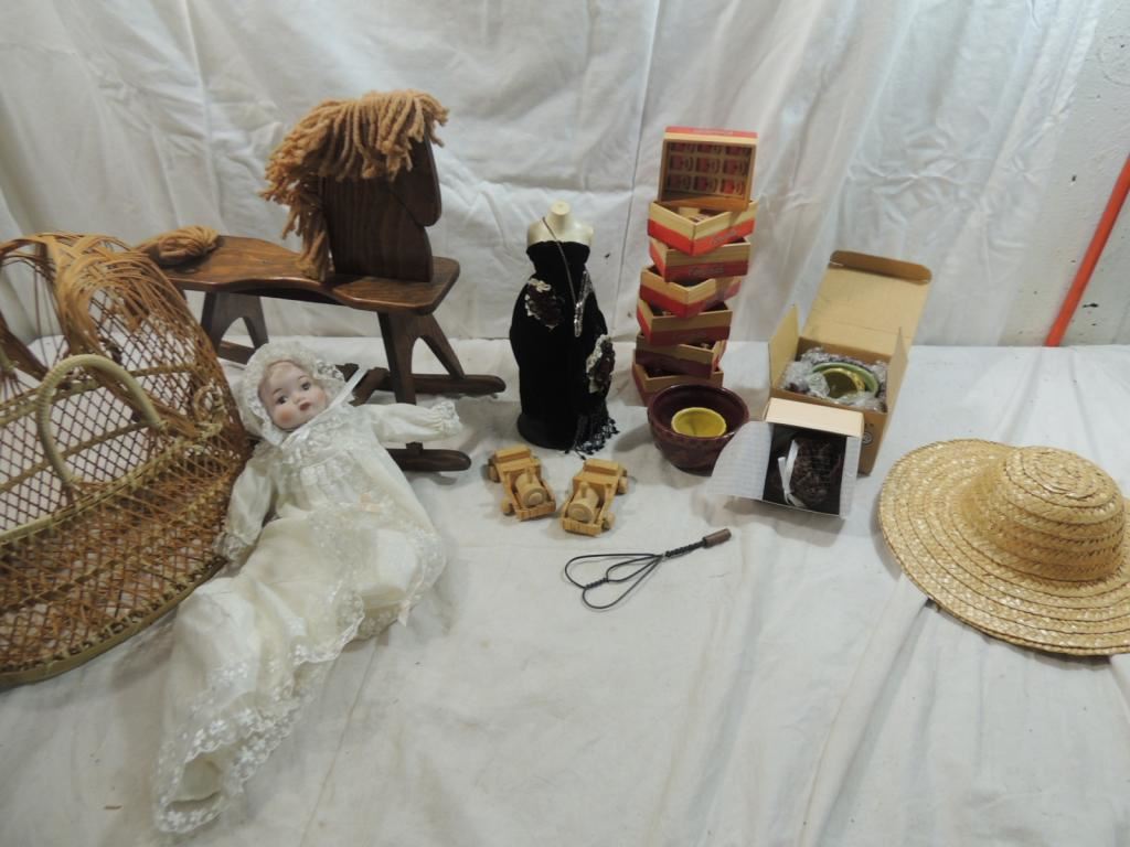 DOLL CRADDLE, ROCKING HORSE, BOYDS COLLECTION ACCESSORIES, VINTAGE ACCESSORIES AS SHOWN SEE PHOTO FOR MORE DETAILS.