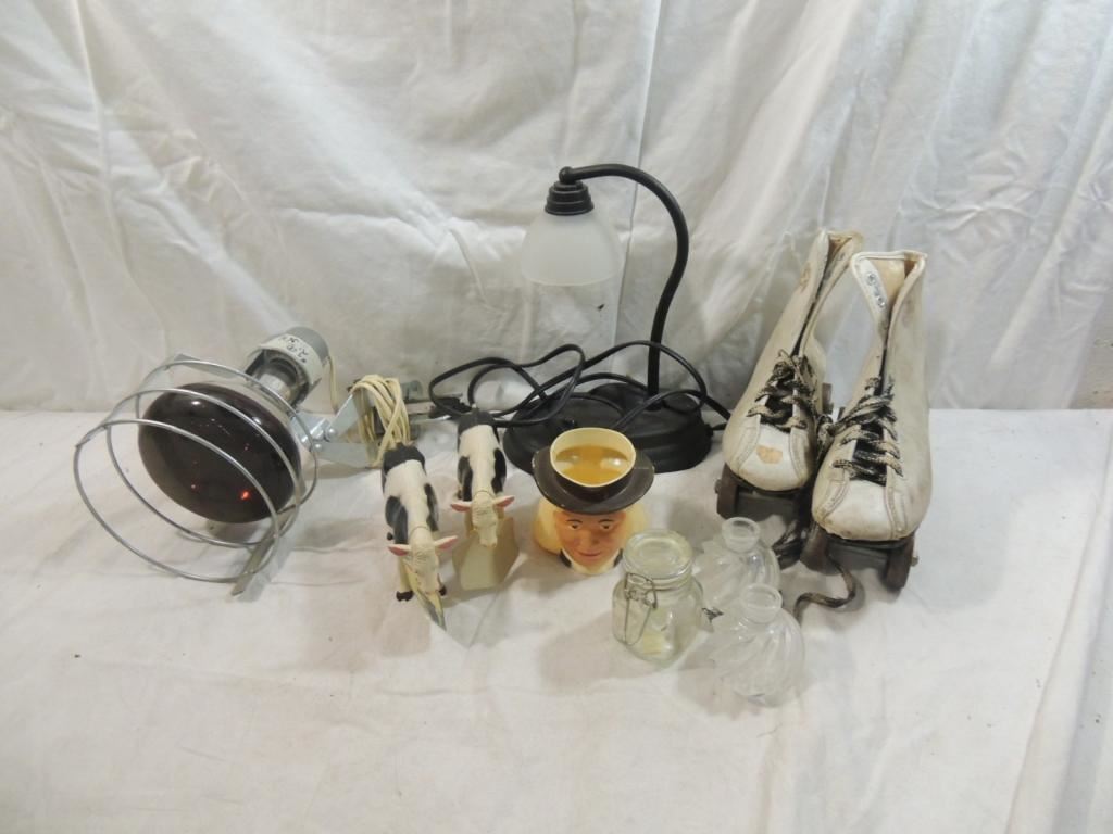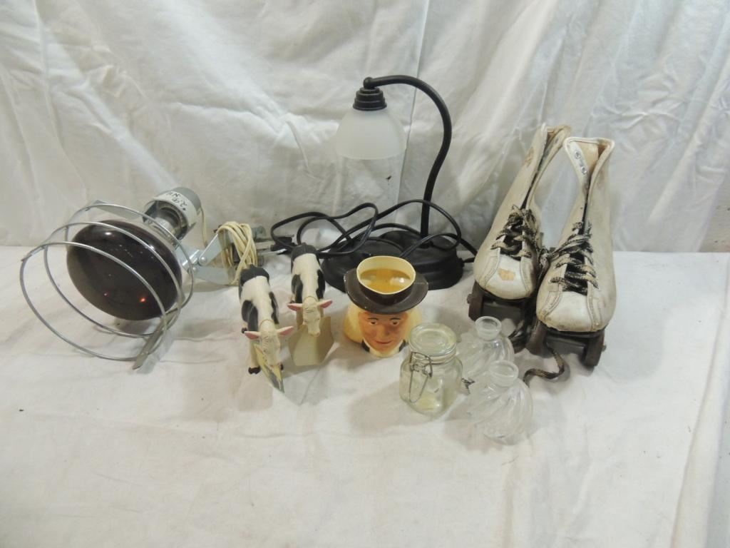 RED LIGHT, HEAT LIGHT?, TABLE LAMP, VINTAGE ROLLER SKATES, STEEL WHEELS, VITNAGE CUPS, GLASSES, VINTAGE ITEMS, WOODEN CRATE BOX, AS SHOWN SEE PHOTO FOR MORE DETAILS.