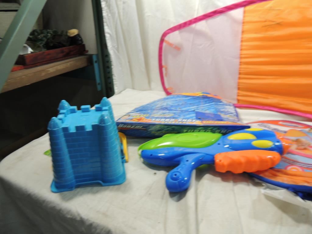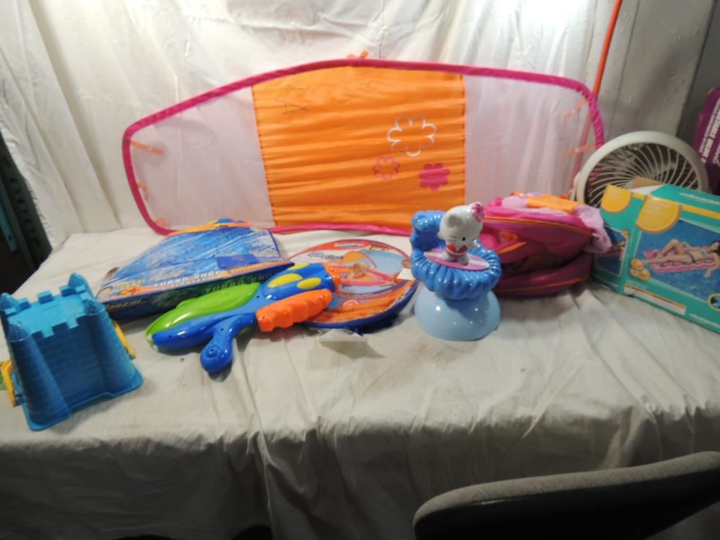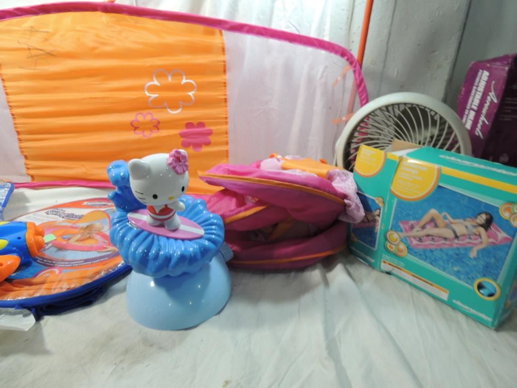 BABY FLOAT, HELLO KITTY SPRINKLER, WATER GUNS, BUCKET, AS SHOWN SEE PHOTO FOR MORE DETAILS.