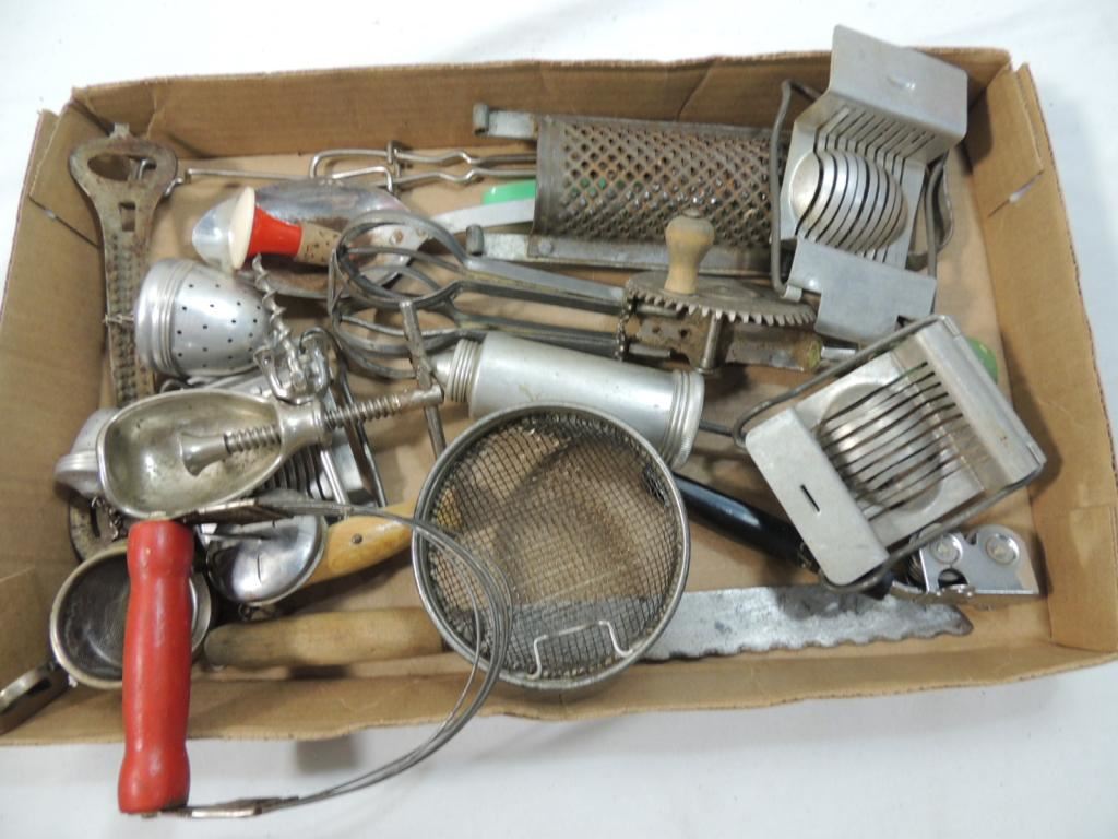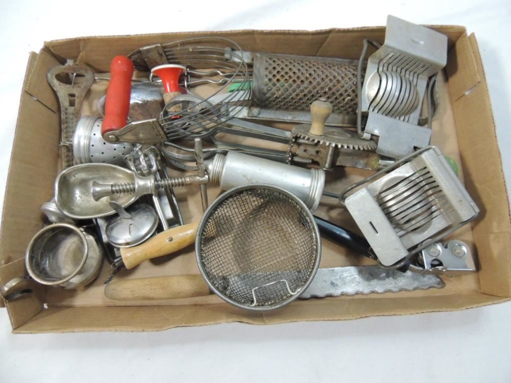 VINTAGE KITCHEN UTENSILS ASSORTED, VINTAGE METAL COLLECTIBLE KICHENILA, AS SHOWN SEE PHOTO FOR MORE DETAILS.