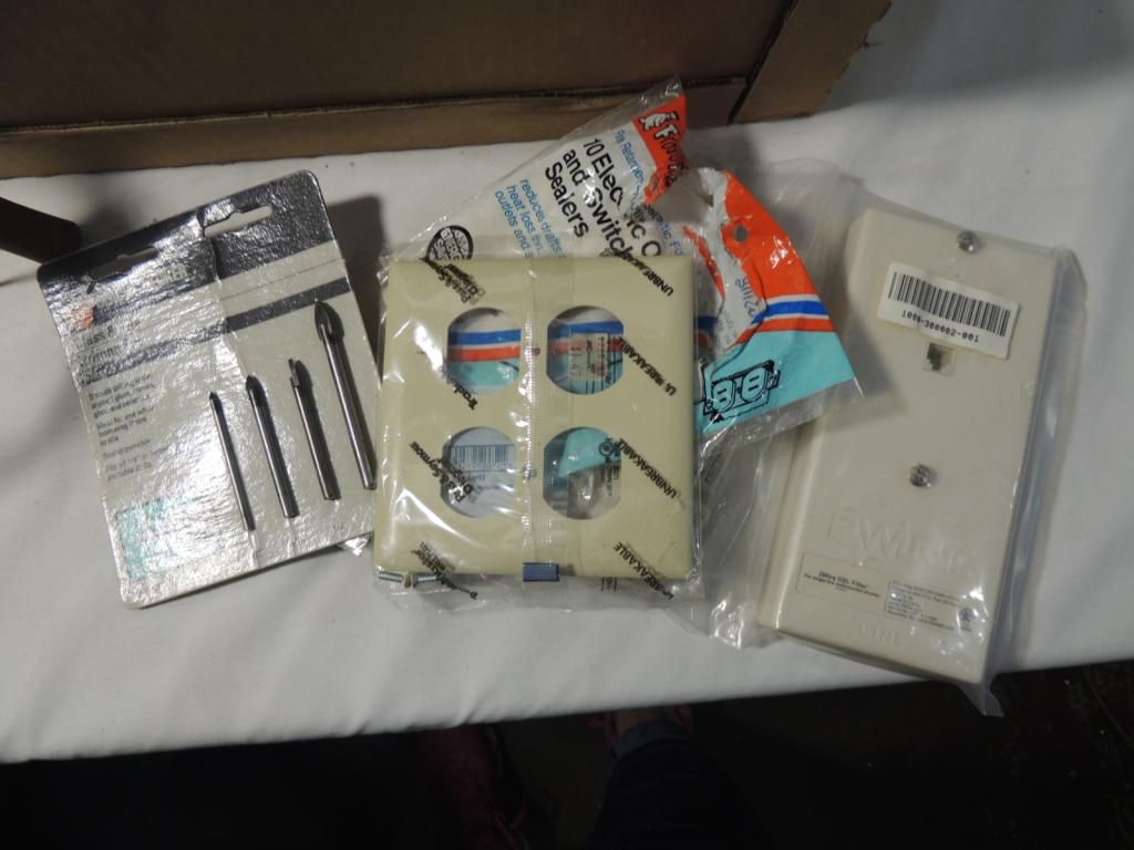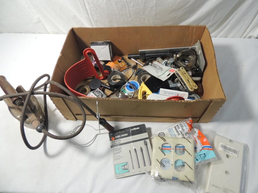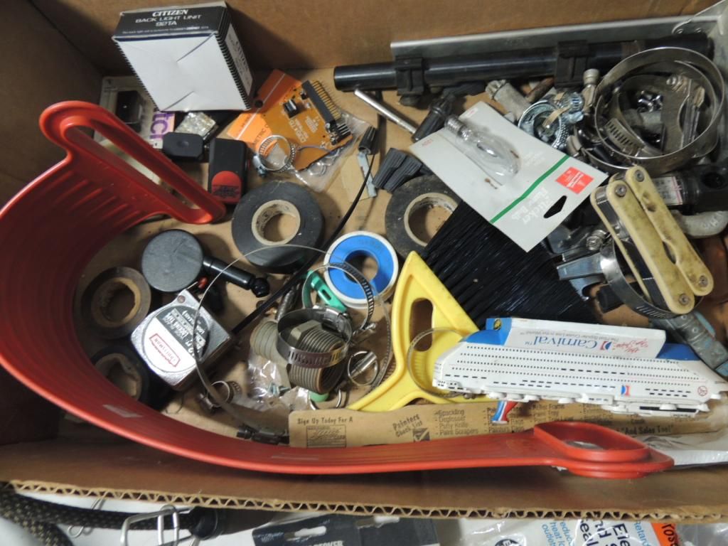 JACKPOT BOX VINTAGE TOOLS & PARTS. ASSORTED METAL IRON, CLAMPS, LIGHTBULBS, KEYCHAIN, MULTI TOOL, CLIPS, ASSORTED. AS SHOWN SEE PHOTO FOR MORE DETAILS.