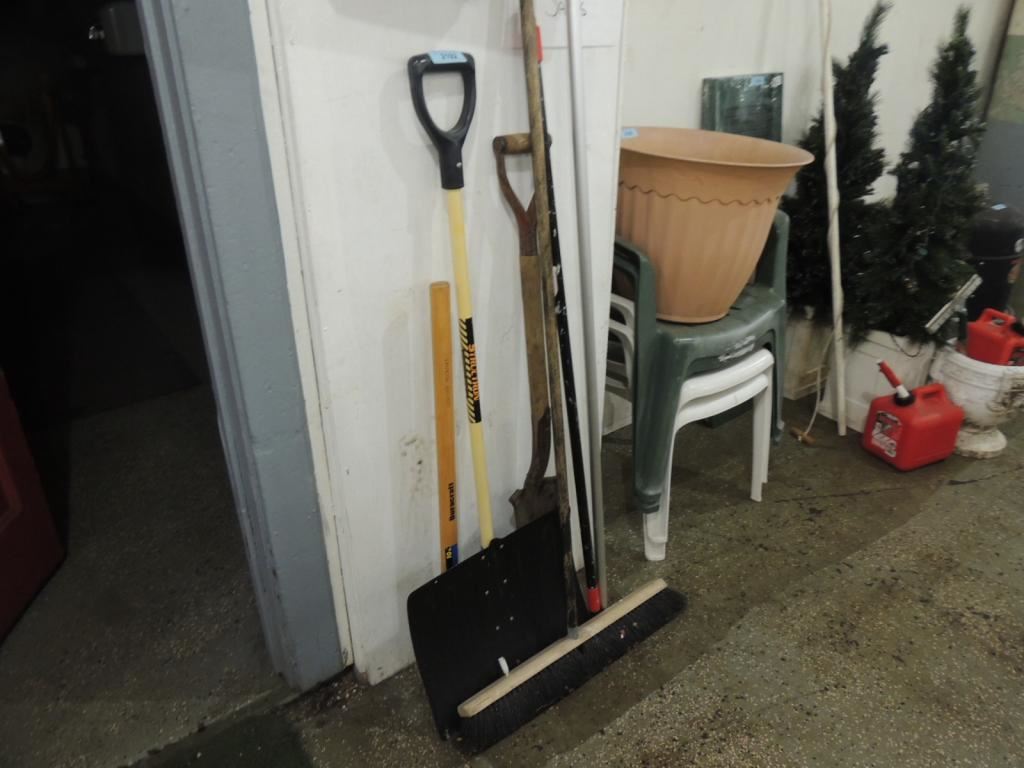 BROOM, SNOW SHOVELS, SHOVELS, EXTENDERS, YARD TOOL, LAWN TOOLS AS SHOWN SEE PHOTO FOR MORE DETAILS.
