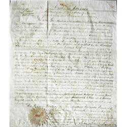 <b>103. ANDREW JACKSON</b> (1767 - 1845) Seventh President of the United States, "Old Hickory" became a national hero in his defense of New Orleans and as president encouraged Western expansion and paid off the national debt. D.S. as President 1p. folio parchment, Washington, Nov .1, 1838, regarding a transfer of land to a man for military service. Engrossment quite faded, the usual cocking and folds, overall good condition. Matter with a an engraved portrait of Jackson and ready to frame. Should be viewed.<b>$1,000-1,500</b>