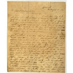 <b>754. (ANDREW JACKSON) </b>(1767 - 1845) Seventh President of the United States, "Old Hickory" became a national hero in his defense of New Orleans and as president encouraged Western expansion and paid off the national debt. A poignant letter by an orphaned girl, Mary E. West, 4pp. 4to., Zanesville, Oh. [n.p., n.d.] written to Andrew Jackson at the Hermitage in Tennessee. In part: <i>"...I must first beg to be forgiven for the boldness of addressing a letter to a gentleman and a stranger. I hope that if General Jackson does consider me for writing it will be with a mild and lenient hand for I do assure him that ceverity [sic] in this my last appeal would crush me...I am an orphan girl without a relative that I know of in this wide world - when I was 14 years old J. Gibson became acquainted with me (I might say he found me for I was working for my daily bread in the town of Canandaigua in the state of NY.) and from that hour until his Death I never new [sic] want or sorrow, he sent me to school to the Ontario Female Seminary when I was 18 yeas old...he left me $100 and his wach [sic] with an education and test for above that which my little fortune could sustain - he had asked his father consent to marry me which was positively refused his father told him that if he married a beggar (meaning me) he would out him off without a cent...hardly was this my only friend consigned to that last resting place...when his sisters threw out vile insinuations against my character, the it was that I felt my utter loneliness...will you give me a home beneath your roof this is my request; can you grant it; I will work I will sew I will try to earn my living if you will, but let me come I will [?] with my life General Jackson I am a beggar and I fear that I shall say to much, more than a beggar should but I do think that if you were here that I could pleade my own cause in such manner that you would decide favorably...</i>". Much more sad content. Small loss from seal tear affecting a few words, light soiling, otherwise very good.<b>$100-150</b>