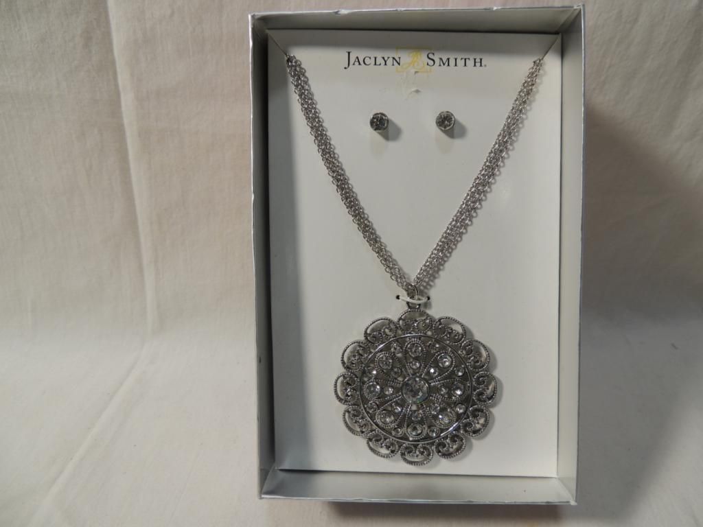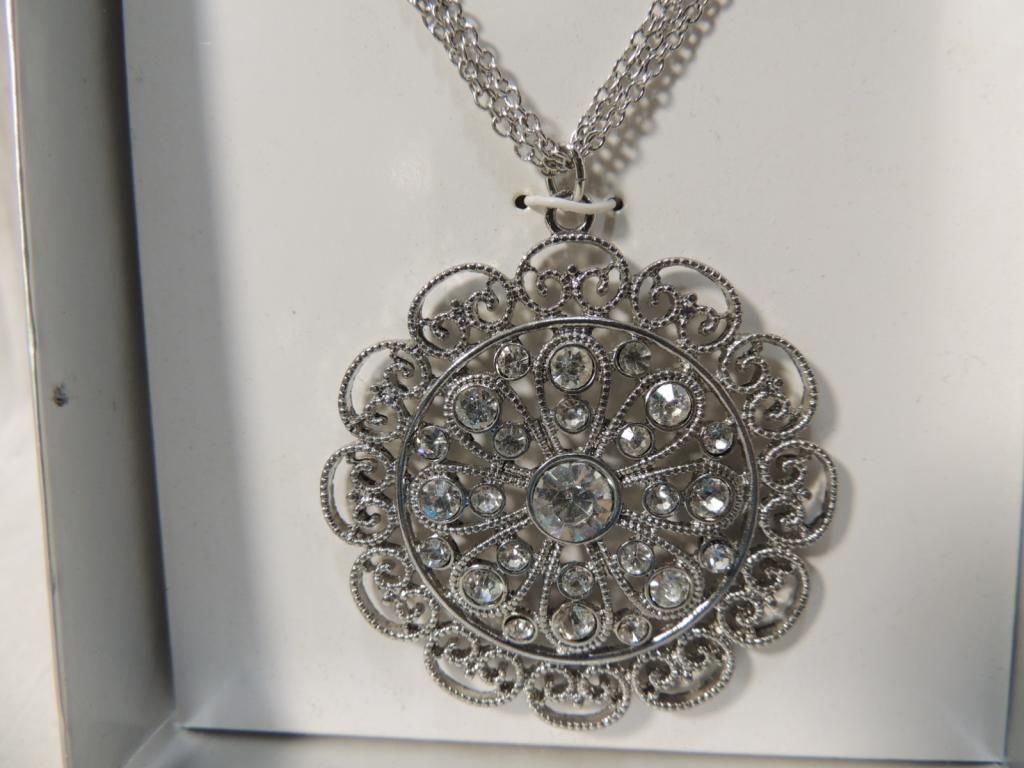 PENDANT NECKLACE SILVERTONE CZ STONES MULTI CHAIN NECKLACE. NEW IN BOX. COSTUME JEWELRY. AS SHOWN. SEE PHOTO FOR MORE DETAILS.