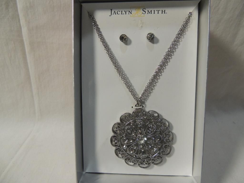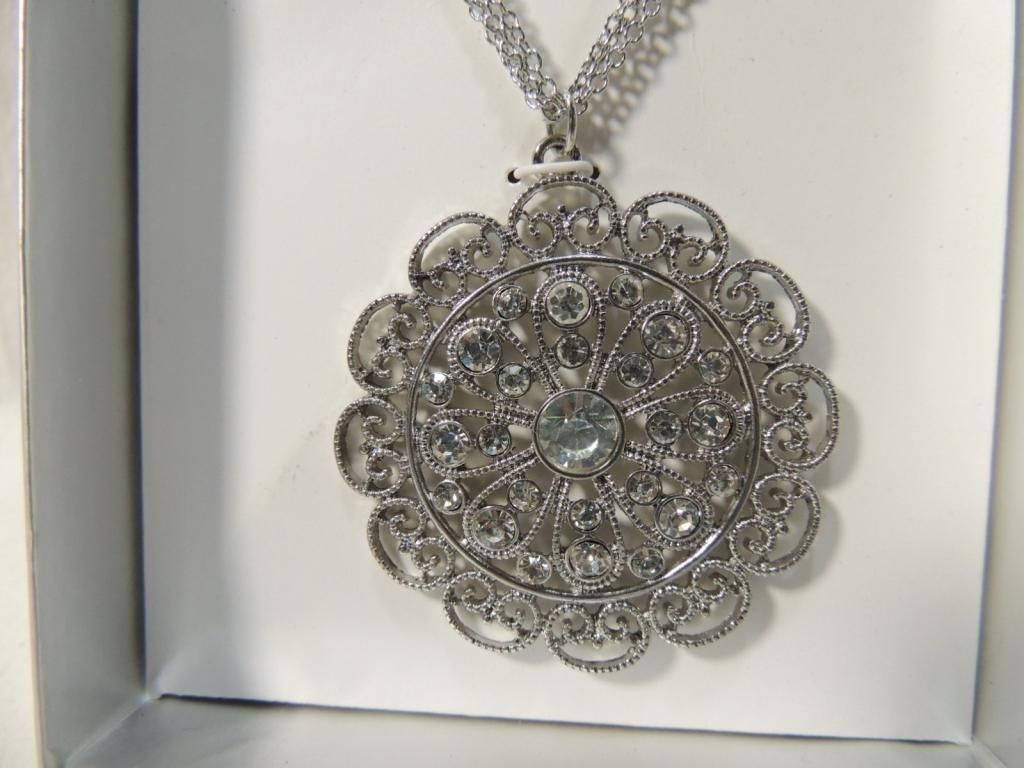 PENDANT NECKLACE SILVERTONE CZ STONES MULTI CHAIN NECKLACE. NEW IN BOX. COSTUME JEWELRY. AS SHOWN. SEE PHOTO FOR MORE DETAILS.