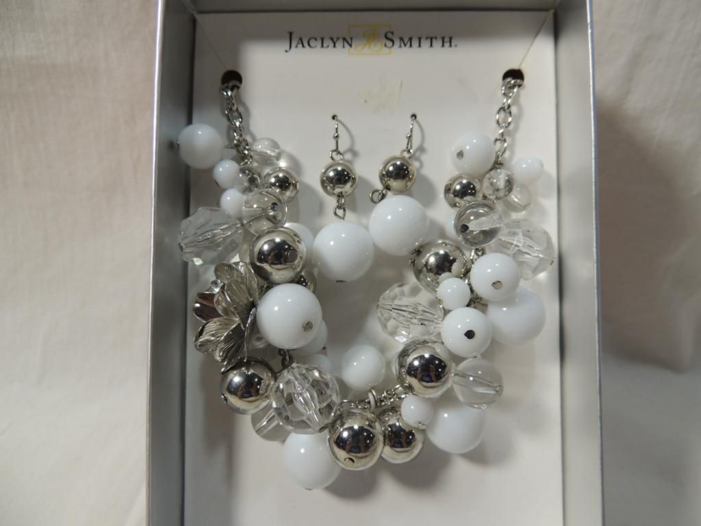 WHITE AND SILVERTONE BEADED STATEMENT NECKLACE AND EARRINGS. JACLYN SMITH NEW IN BOX DESIGNER JEWELRY. FASHION JEWELRY COSTUME JEWELRY. MATCHING SET. NEW AS SHOWN. SEE PHOTO FOR MORE DETAILS.