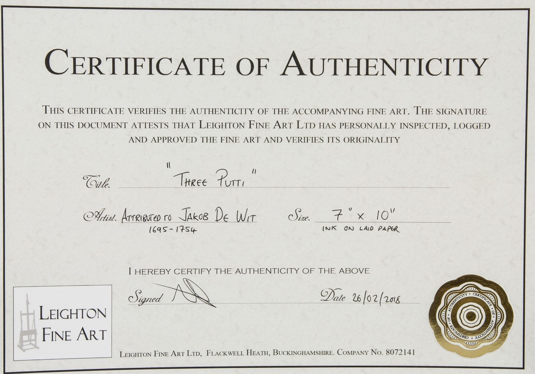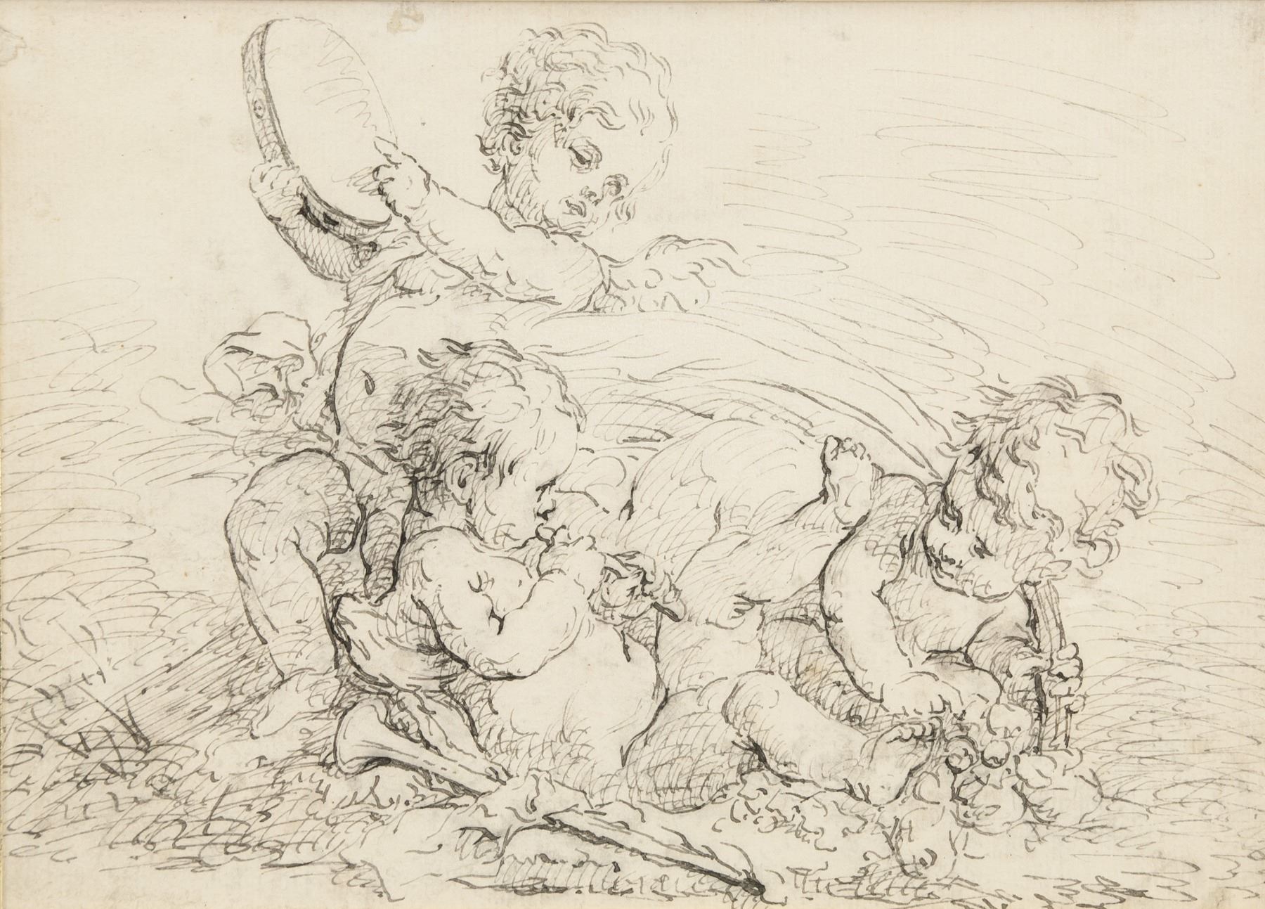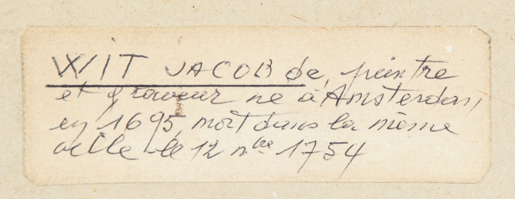 Ink on laid paper. Featuring Three Angels. Signed and attr. Jacob de Wit (Dutch, c.1695-1754). 2.8 x 3.9 in. (7 x 10 cm). Jacob de Wit was born in Amsterdam, and became famous for his door and ceiling paintings. He lived on the Keizersgracht in Amsterdam, and many of the buildings on the Keizersgracht still have door or ceiling paintings done by him. Since many of the families who lived in Amsterdam in those days had country villas, de Wit also painted in houses in the fashionable areas of Haarlem and the Vecht river. According to the RKD he was the pupil of Albert van Spiers in Amsterdam and Jacob van Hal in Antwerp where he became a member of the Guild of St. Luke in 1714. While in Antwerp, he made a series of watercolor sketches of the Rubens ceilings in the Carolus Borromeuskerk in Antwerp. After the church was struck by lightning in 1718 these became a historical document, and his pupil Jan Punt later engraved his sketches and published them in 1751. His pupils were Jan de Groot (painter from The Hague), Dionys van Nijmegen, Jan Punt, Pieter Tanje, and the brothers Frans and Jacob Xavery. Jacob de Wit died in Amsterdam in 1754. Tako Hajo Jelgersma was his follower.
