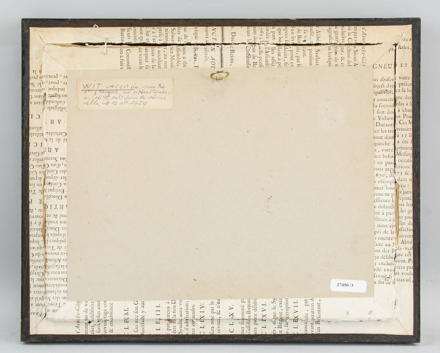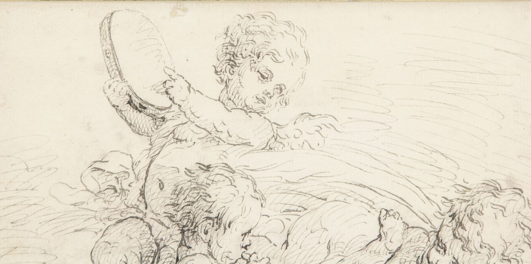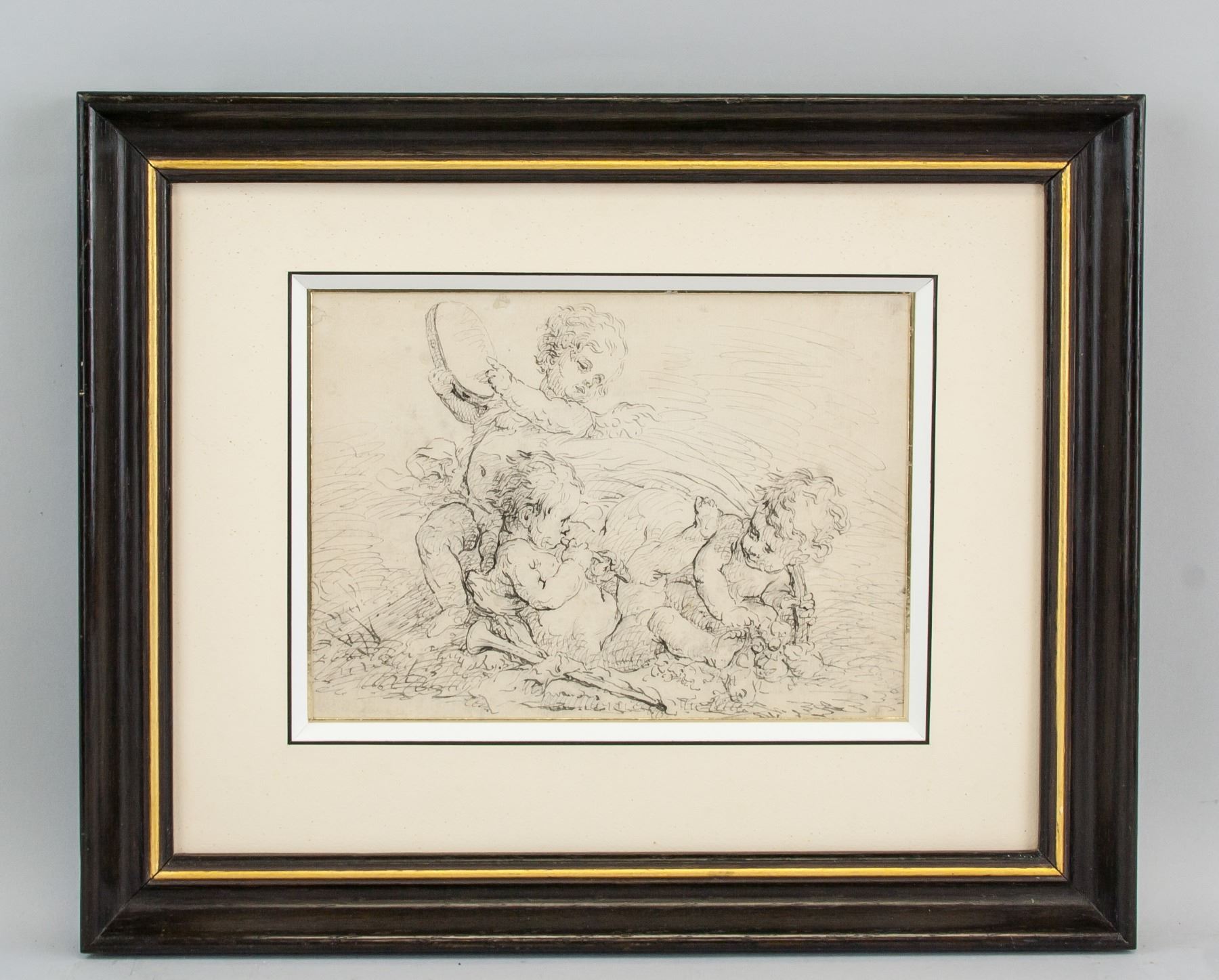 Ink on laid paper. Featuring Three Angels. Signed and attr. Jacob de Wit (Dutch, c.1695-1754). 2.8 x 3.9 in. (7 x 10 cm). Jacob de Wit was born in Amsterdam, and became famous for his door and ceiling paintings. He lived on the Keizersgracht in Amsterdam, and many of the buildings on the Keizersgracht still have door or ceiling paintings done by him. Since many of the families who lived in Amsterdam in those days had country villas, de Wit also painted in houses in the fashionable areas of Haarlem and the Vecht river. According to the RKD he was the pupil of Albert van Spiers in Amsterdam and Jacob van Hal in Antwerp where he became a member of the Guild of St. Luke in 1714. While in Antwerp, he made a series of watercolor sketches of the Rubens ceilings in the Carolus Borromeuskerk in Antwerp. After the church was struck by lightning in 1718 these became a historical document, and his pupil Jan Punt later engraved his sketches and published them in 1751. His pupils were Jan de Groot (painter from The Hague), Dionys van Nijmegen, Jan Punt, Pieter Tanje, and the brothers Frans and Jacob Xavery. Jacob de Wit died in Amsterdam in 1754. Tako Hajo Jelgersma was his follower.