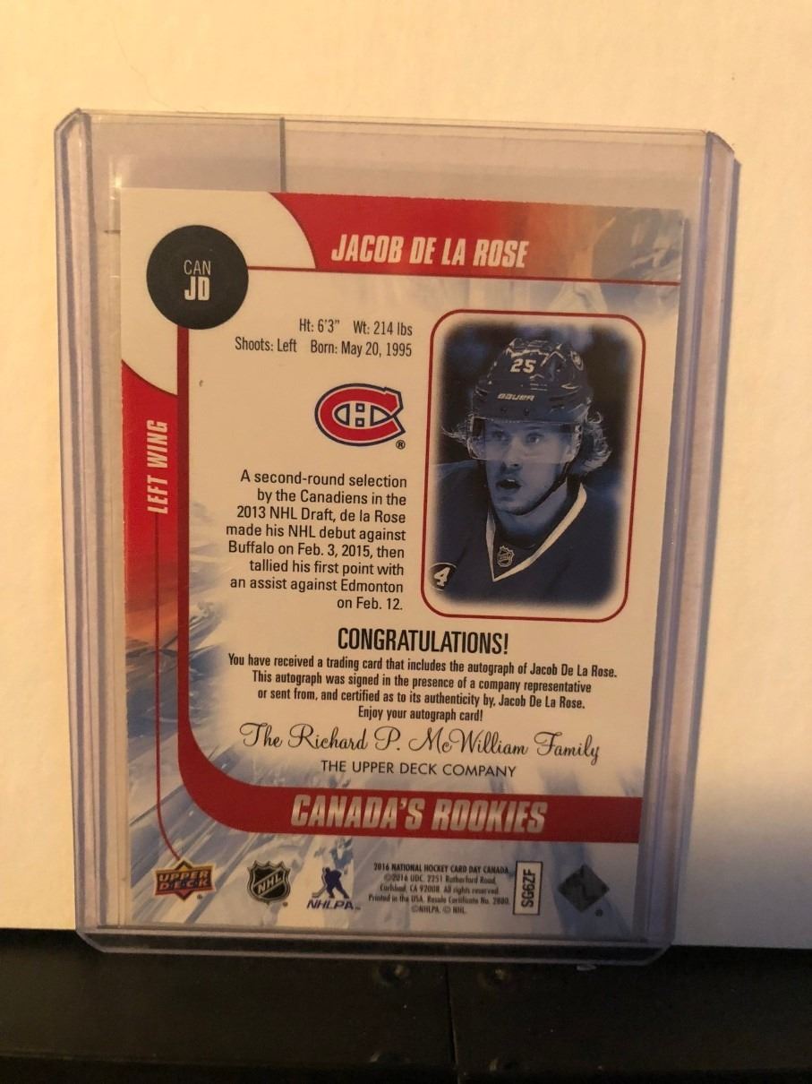 JACOB De La ROSE 2016 UD NHCD AUTOGRAPH