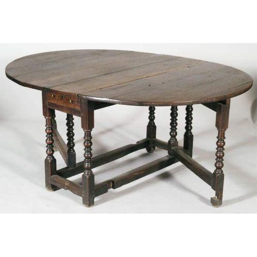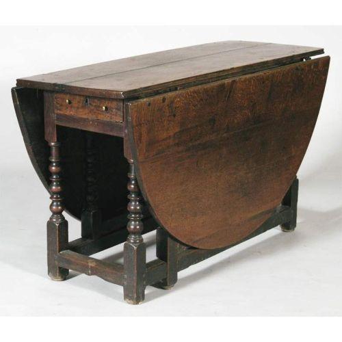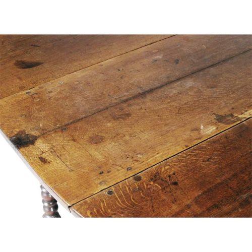 1 JACOBEAN OAK DROP LEAF TABLE 50"long, 29" high, 19" wide circa 1700 CONDITION REPORT: plugs and patches to top, stains, roughness to base.