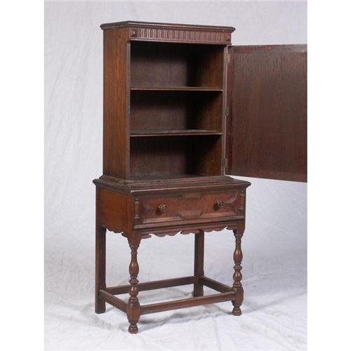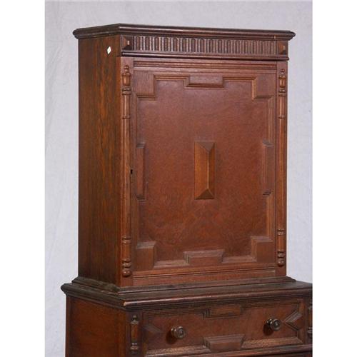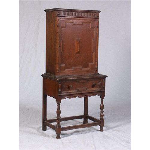 CABINET ON STAND: Jacobean style oak cabinet on stand, geometric molded door and drawer panels, turned legs, box stretcher. 65''h x 18''d x 30''w