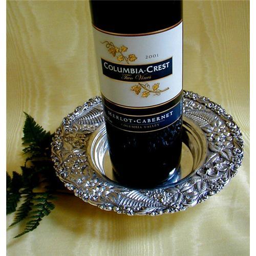 BURTON BROOK FARM ANTIQUES is proud to present a very rare and fine sterling silver wine bottle coaster by one of the finest American silver companies to ever produce hand-made sterling ...JACOBI & JENKINS, BALTIMORE, MARYLAND. This wine coaster with the deeply chased crisp border of ferns and botanicals is rare indeed. It is heavy sterling with center hand-engraved script initials. This wonderful piece is for the collector of the fine and rare. STAMPED: JACOBI & JENKINS / STERLING with their maker mark. <> Please view our other fine sterling items.