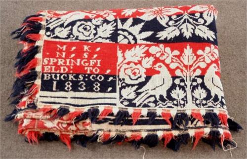 JACQUARD COVERLET red, blue and white dated 1838, Bucks County