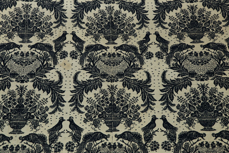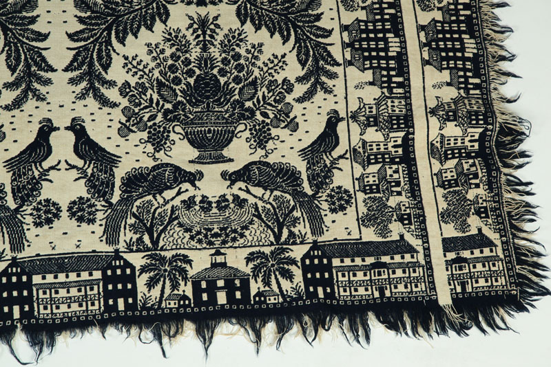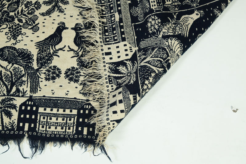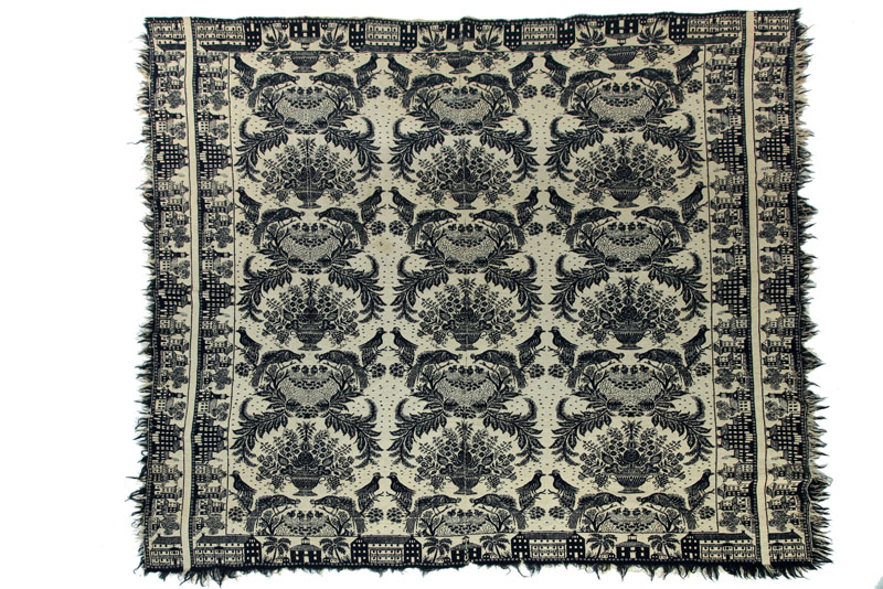 Unsigned, probably Ohio or Indiana, 1830-1860, wool and cotton. Center seam, double weave in blue and white, "Birds Feeding Their Young" centerfield with town border. 74" x 82".