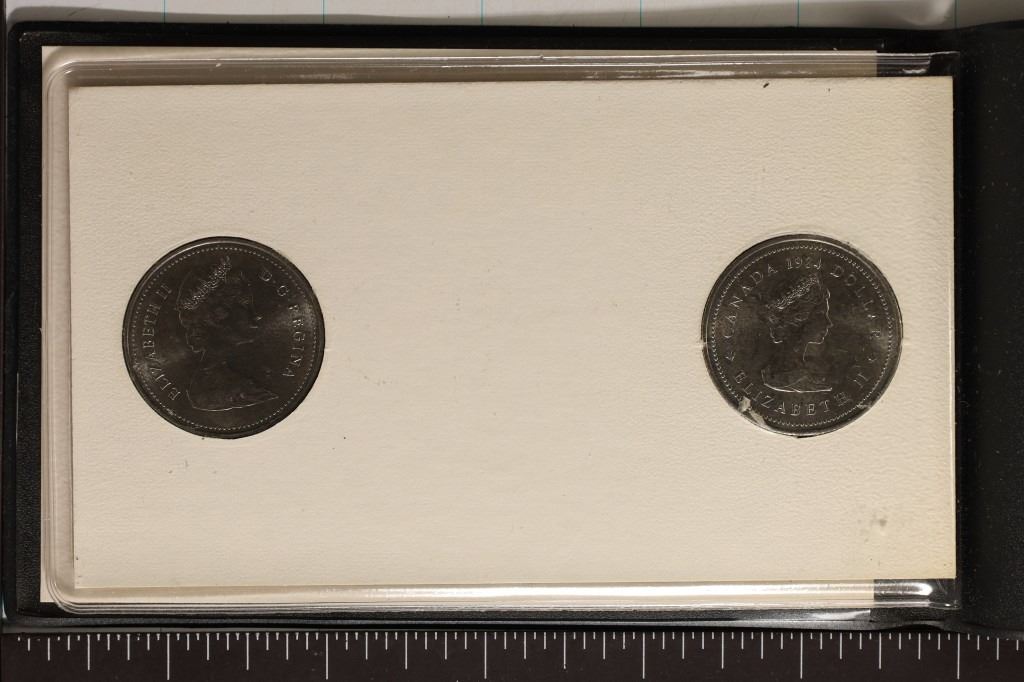 CONTAINS: A 1984 CARTIER DOLLAR UNC AND 1984 REGINA CANOE DOLLAR UNC AND ONE UNCANCELLED 32 CENT CANADA DOLLAR IN BLACK FLIP FOLIO. THE SET IS MARKED 1534-1984