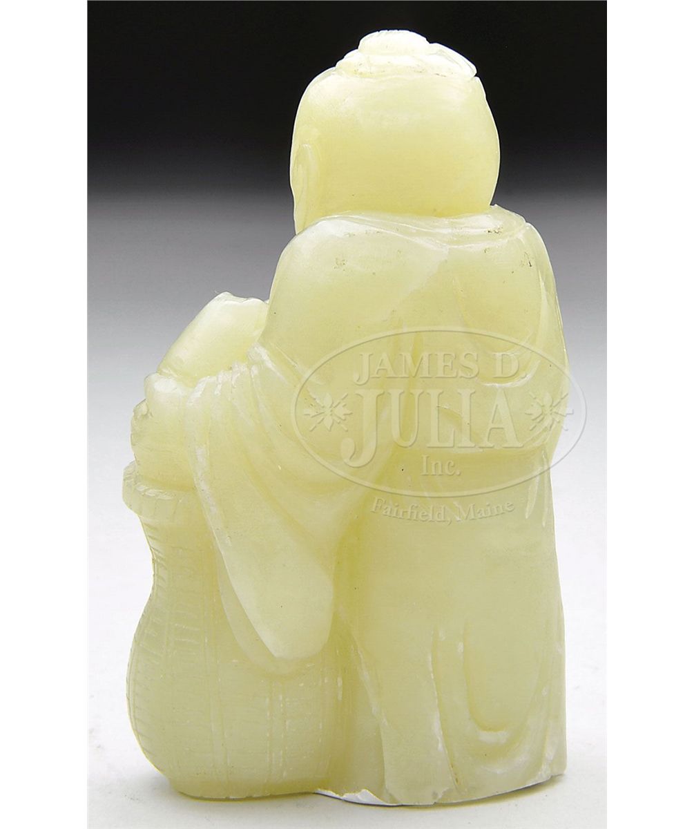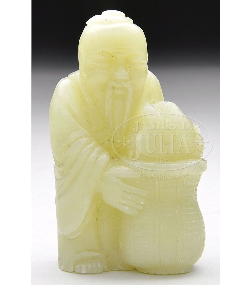 20th century, China. Stone of a pale yellowish green color. Man with a fish in a basket. SIZE: 3" h. CONDITION: Generally very good. 9-92930