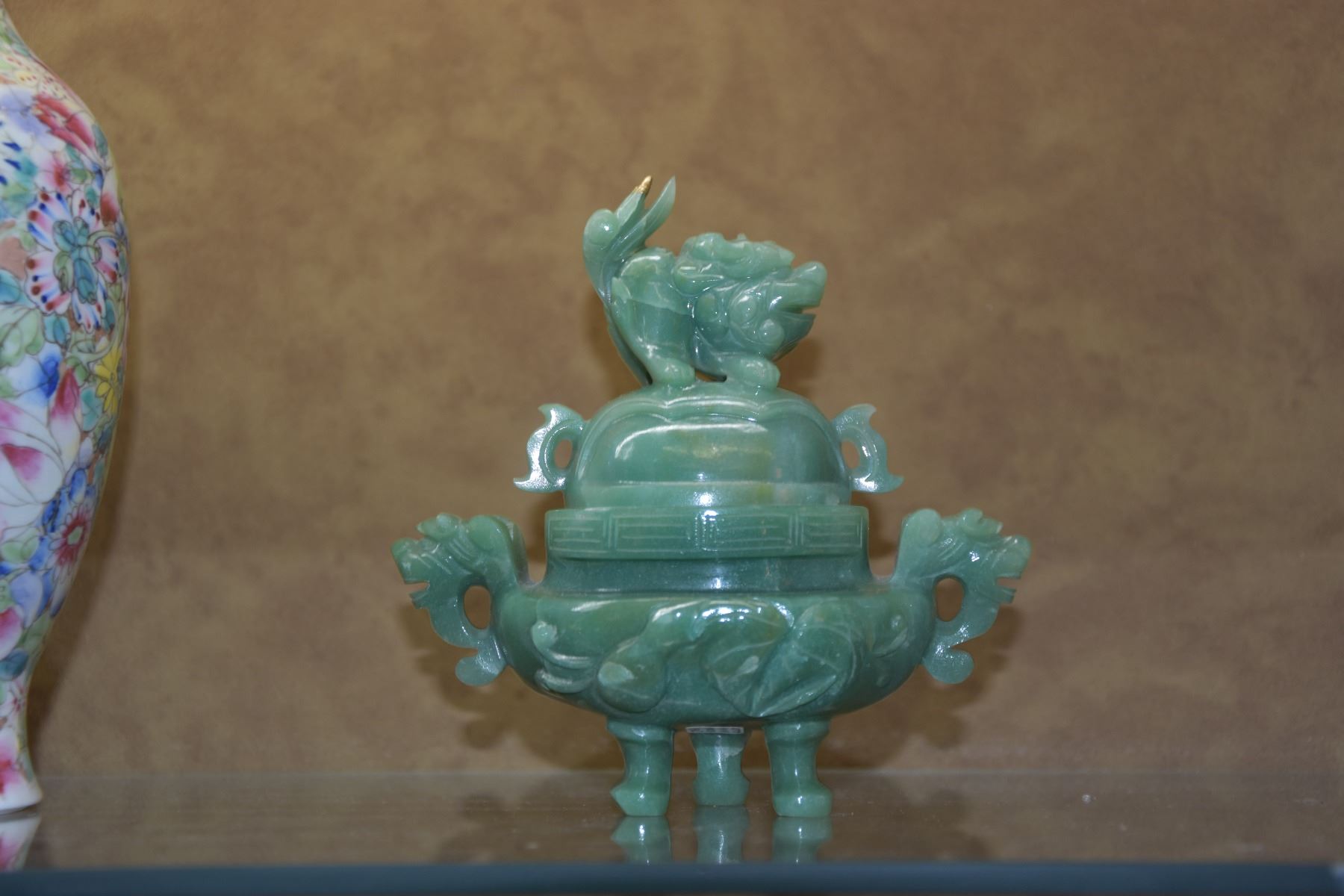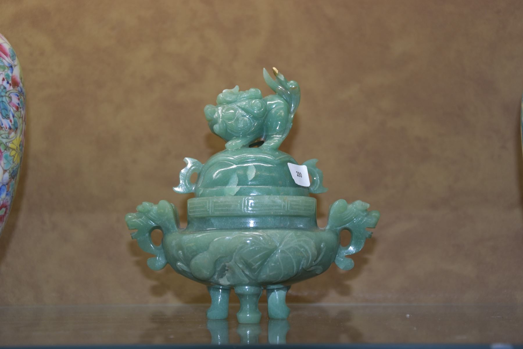 JADE CENSER W/LID & FOO DOG HANDLES (6")