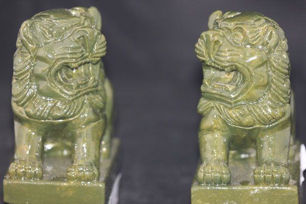 JADE CHINESE GUARDIANS LIONS FIGURINES **|**|** JADE CHINESE GUARDIANS LIONS FIGURINES; W 2IN; L 3.5IN; H 4.8IN; IN CHINESE CULTURE LION IS REGARDED AS THE KING OF THE FOREST AND OF THE OTHER ANIMALS. IT IS USED AS A SYMBOL OF POWER AND GRANDEUR. ; MSRP: $2000
