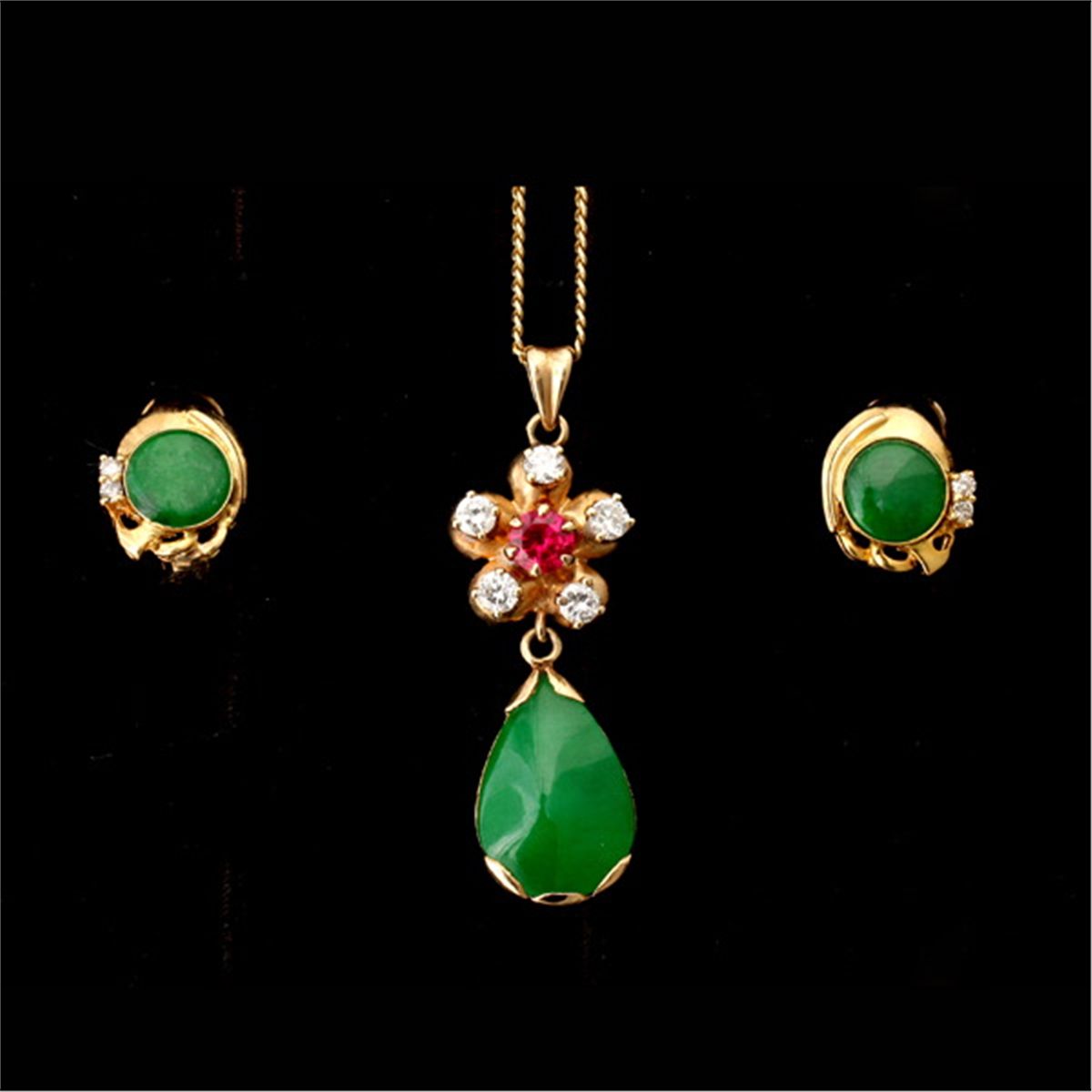 JADE, DIAMOND, SYN. RUBY, 14K Y/G JEWELRY SUITE.
