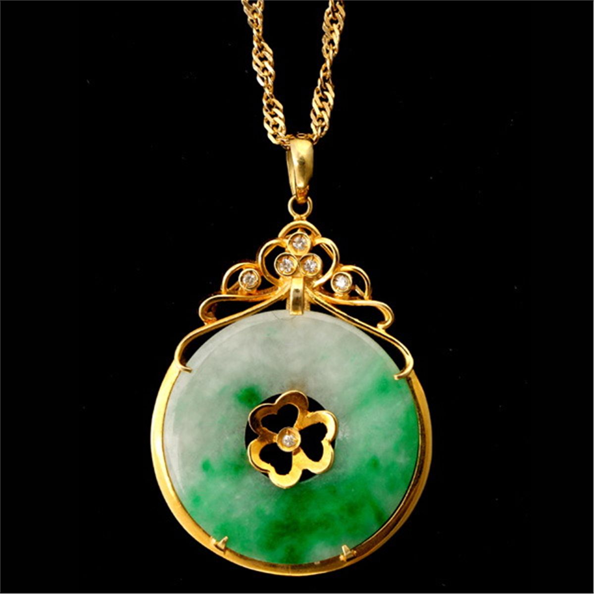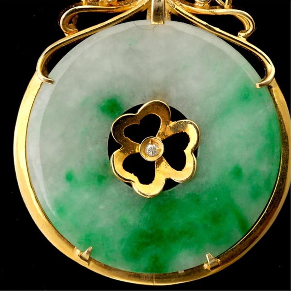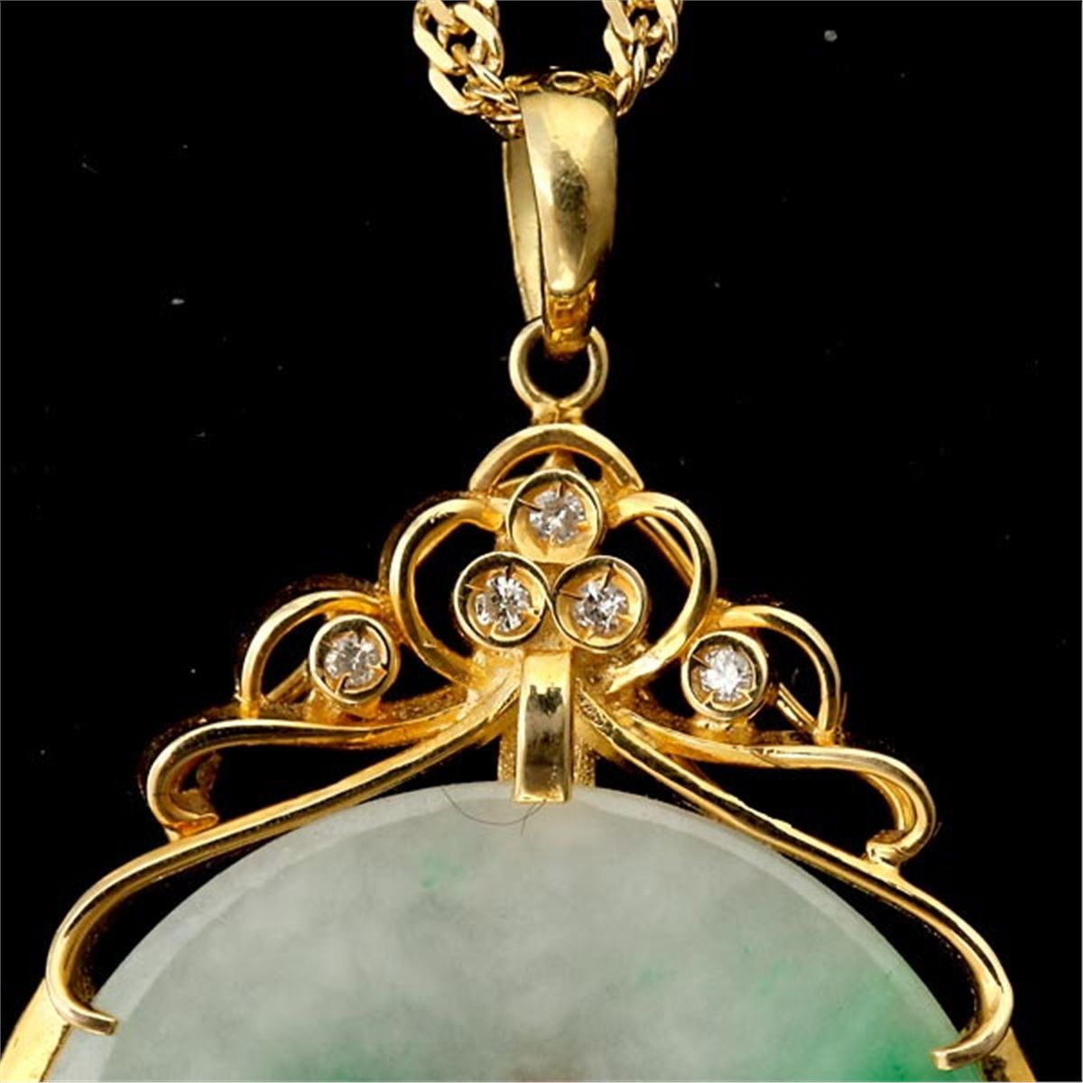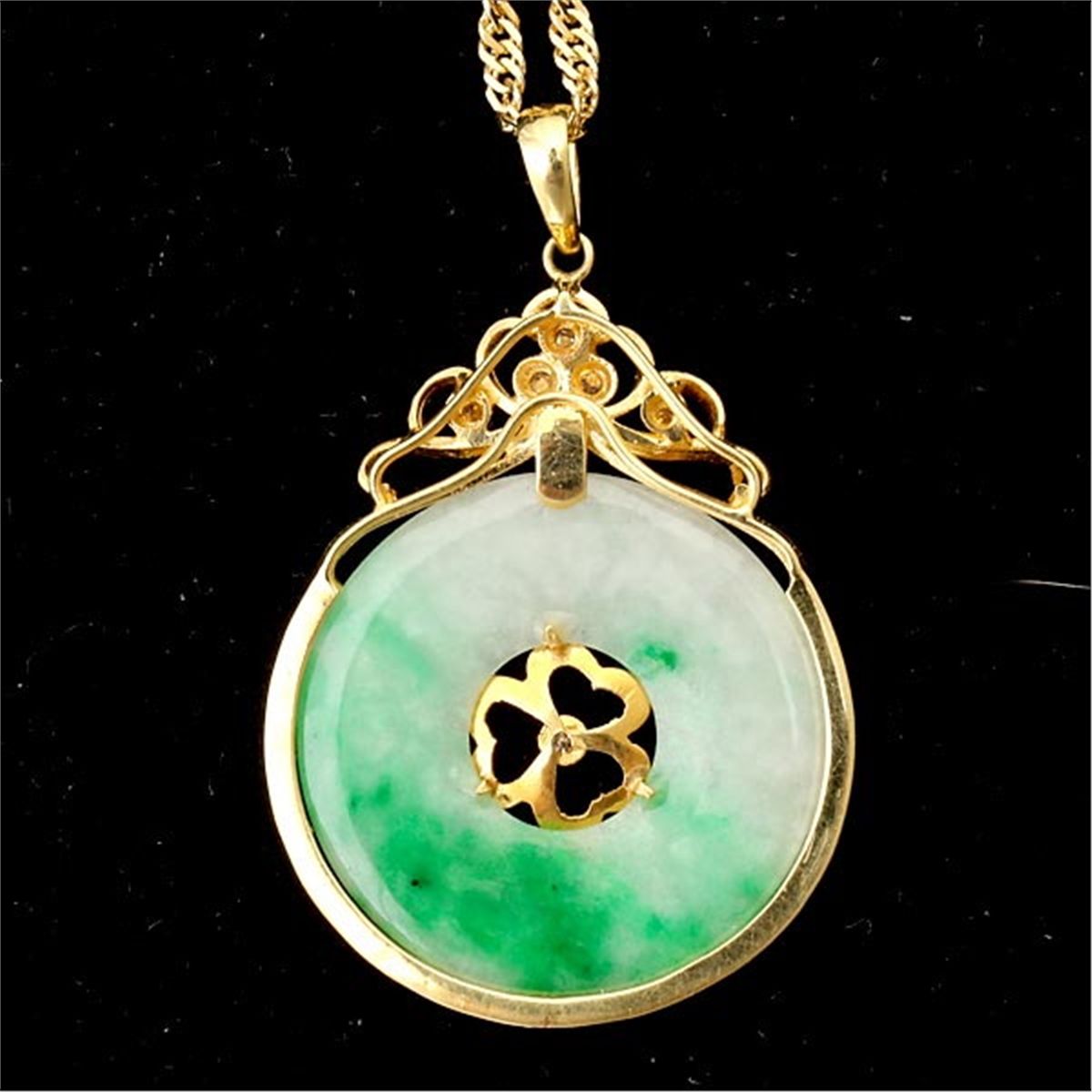 JADEITE, DIAMOND, 18K YELLOW GOLD PENDANT-NECKLACE. Centering one jade "Pi" accented by six full-cut diamonds weighing a total of approximately 0.06 ct., bead set in 18k yellow gold, suspended from an 18k yellow gold chain.