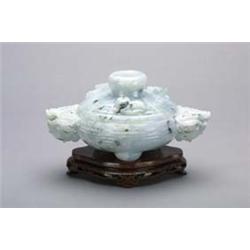 Large and very elaborately carved, Chinese jadeite archaic bronze-form tripod koro and cover, openwork kylin handles, three buffalo on cover, mottled translucent green with some lavender suffusions; W: 10 1/2", inlaid wood stand