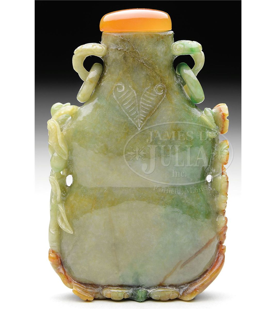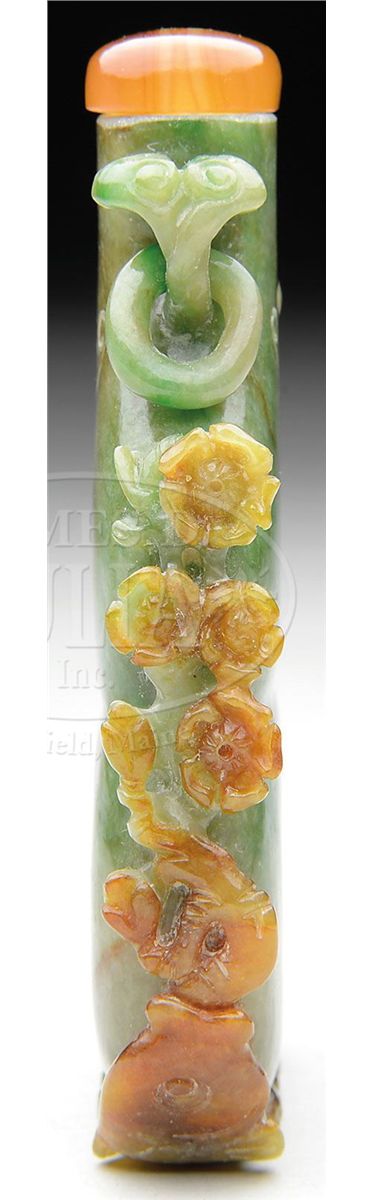20th century, China. Double gourd form. Lavender brown stone with green markings and russet areas. Surface carved and pierced with peaches, flowering trees, birds, and fishes. SIZE: 3" h. CONDITION: Very good. 7-74288