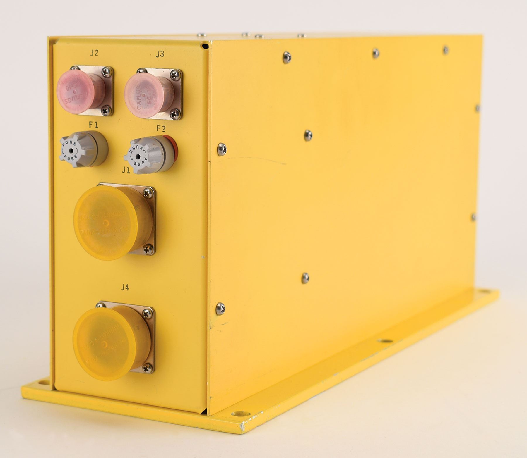 Backup Flight Controller Substitute Unit from the JSC Avionics Engineering Laboratory (JAEL), measuring 5 x 15 x 7.25, marked on the end as "P/N SED36136375-301, S/N 1003." One end had connectors marked "J1," "J2," "J3," and "J4," and fuses marked "F1" and "F2." In very good to fine condition.