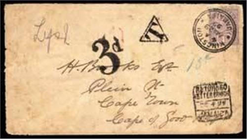 1899 underpaid cover from Kingston to Cape Town franked by 1889 1d tied by Kingston/Jamaica cds for AU.29.1899 with 'T' in triangle and 3d h/s alongside as well as m/s 15c below stamp, envelope not called for in Cape Town and backstamped with a Charge Cle