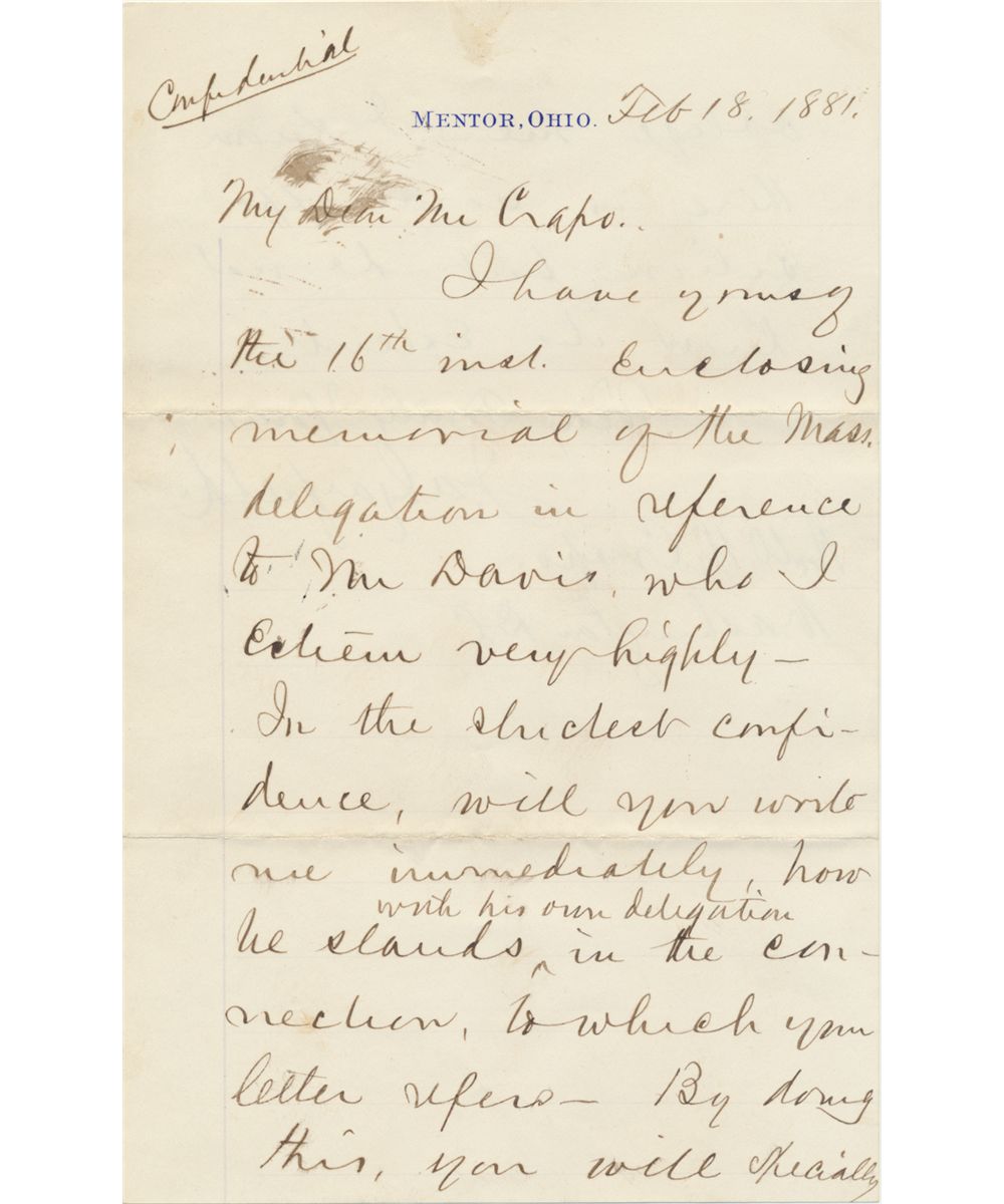 (1831 - 1881) Twentieth President of the United States, Union army major general, assassinated while in office. Rare fine political content A.L.S. as President-Elect, 2pp. 8vo., Mentor, Feb. 18, 1881 (just two weeks before he would be sworn-in as President), to three-term Massachusetts U.S. Rep. WILLIAM W. CRAPO (1830-1926). Marked, "Confidential", the letter reads, in part: "...I have yours of the 16th inst. enclosing memorial of the Mass. delegation in reference to Mr. [Horace] Davis who I esteem very highly. In the strictest confidence, will you write me immediately, how he stands with his own delegation in the connection to which your letter refers. By doing this, you will specially oblige me. I know there is some opposition, but do not know its extent...". Very good. Accompanied by an envelope signed at top: "from J. A. Garfield" and addressed: "Only for Hon. W. W. Crapo". Horace Davis (1831-1916) was the son of Mass. Gov. John Davis and a U.S. Representative from California. In the In the hotly-contested 1880 presidential election, California's electoral votes had gone to Winfield Scott Hancock, but through no lack of trying on Davis' part. However, Garfield's consideration of Davis for a cabinet post was futile, stymied by his Democratic adversaries. This is further explained in a letter from Crapo to Davis' wife, 3pp. 8vo., sent from New Bedford to her in 1898. He bitterly notes: "...your husband was seriously considered for the cabinet by President Garfield...I had letters sustaining this fact...I came across the one which I enclose...I was very much in earnest in promoting the appointment. I was a shame that self-seeking and small-minded men from California interfered to the great detriment of the national service...". Also present are two cabinet photographs, one showing Garfield as presidential candidate from the chest, up in an oval image, captioned: "Gen. James A. Garfield. Republican Candidate for President, 1880". Image bears some foxing, small tear at bottom margin, the second a similar view but as President. Four pieces.