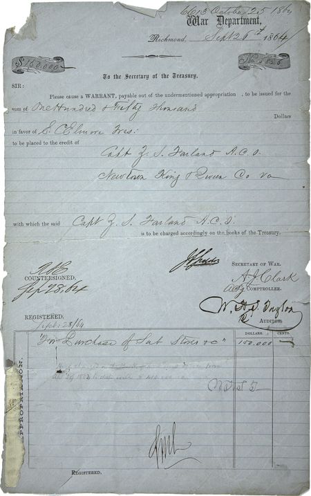 (1815-1880) Confederate Secretary of War from 1862 until February 1865, when he was sacked because of his removal of Johnston at Atlanta. War date partly-printed D.S. "J A Seddon" as Secretary of War, 1p. legal folio on Confederate War Department letterhead, Sept. 26, 1864 being a pay warrant for $150,000 to be paid to Confederate Treasurer E. C Elmore "...to be placed to the credit of Capt. Z. S. Farland A.C. S. Newton King & Queen Co. Va....". The use of the vast sum, noted at the bottom, was for "...Purchase of Sub Stores &c....". Marginal wear, weak folds repaired on verso, else very good.